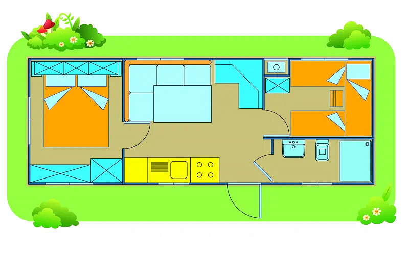 24 m² - pokój dzienny z aneksem kuchennym i ławką dla 1 osoby, sypialnia z łóżkiem małżeńskim, sypialnia z 2 łóżkami pojedynczymi i łóżkiem rozkładanym dla 1 dziecka do nieukończonych 13 lat i maks. 60 kg, łazienka, taras z miejscami do siedzenia
