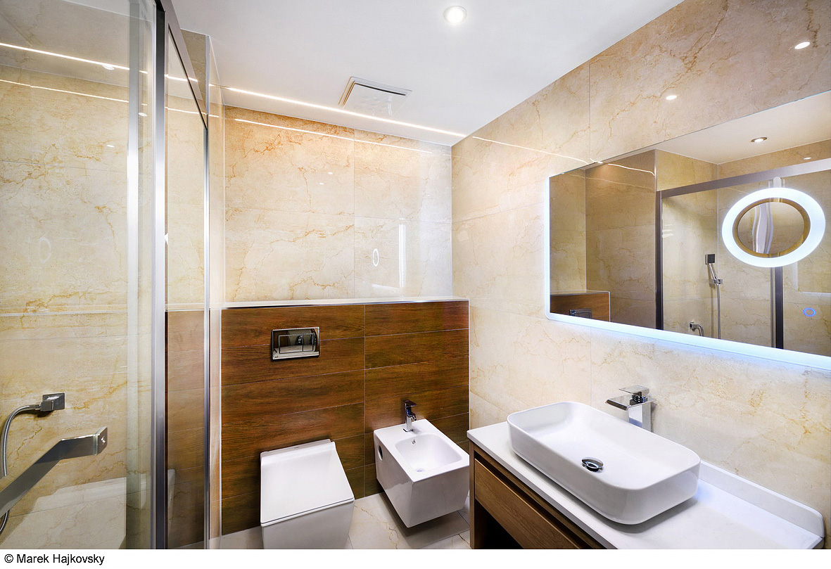 Suite Exclusive 2/3/4 - sypialnia z łóżkiem małżeńskim z osobnymi łóżkami, pokój dzienny z aneksem kuchennym i stołem jadalnym z rozkładaną kanapą dla 2 osób, 2 x łazienka z prysznicem, prywatny taras; 9 piętro z panoramicznym widokiem na park wodny i okolicę