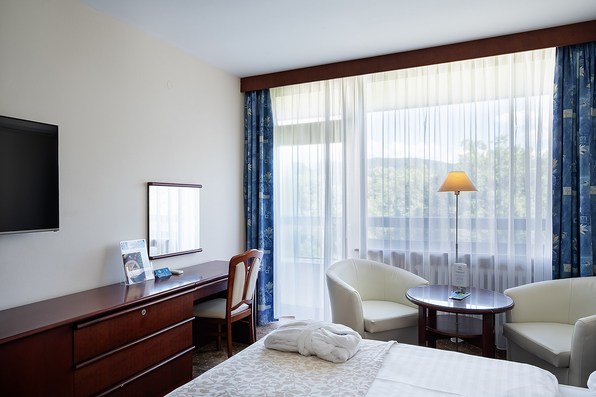 klimatyzacja (z wyjątkiem pokoi Comfort 2+1 A, a 1 A), TV sat., telefon, wi-fi, fén, chladnička, rádio (pokoje v části Esplanade), župan, trezor