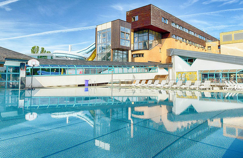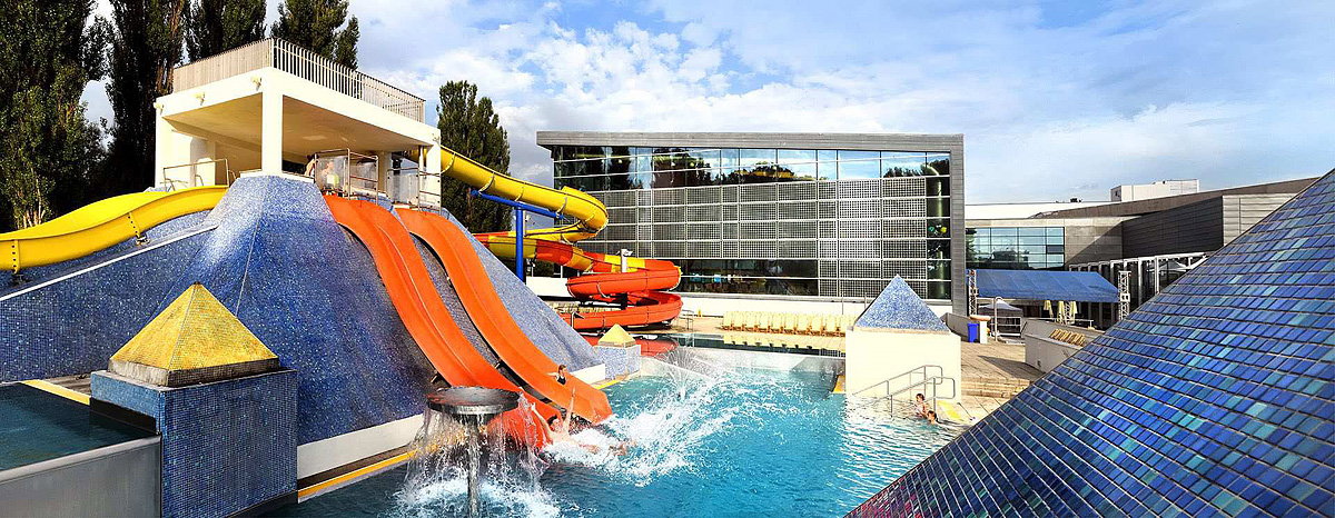 aquapark - (strefa relaksu: 3x zewnętrzny basen termalny z atrakcjami wodnymi i zjeżdżalniami, 2x kryty basen termalny, sauna fińska i parowa, bar wodny, basen pływacki o długości 50 m);