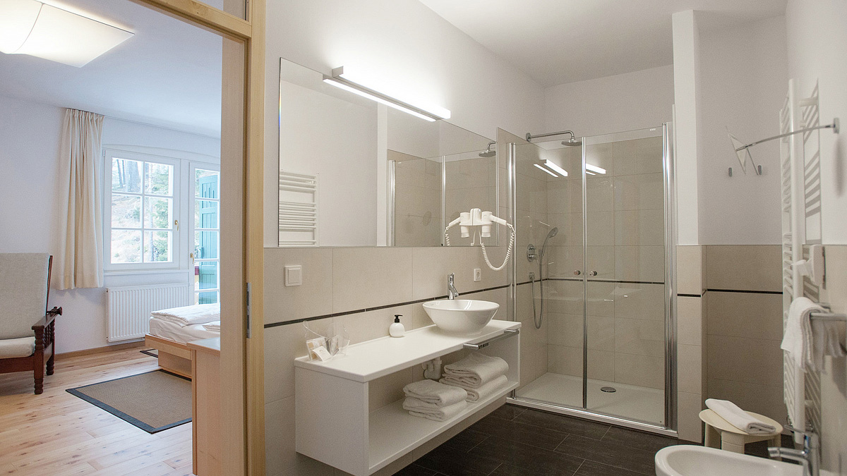 25 do 28 m² - pokój z łóżkiem małżeńskim lub 2 łóżkami pojedynczymi i ewentualnie 1 lub 2 dodatkowymi łóżkami pojedynczymi, łazienka z prysznicem lub wanną