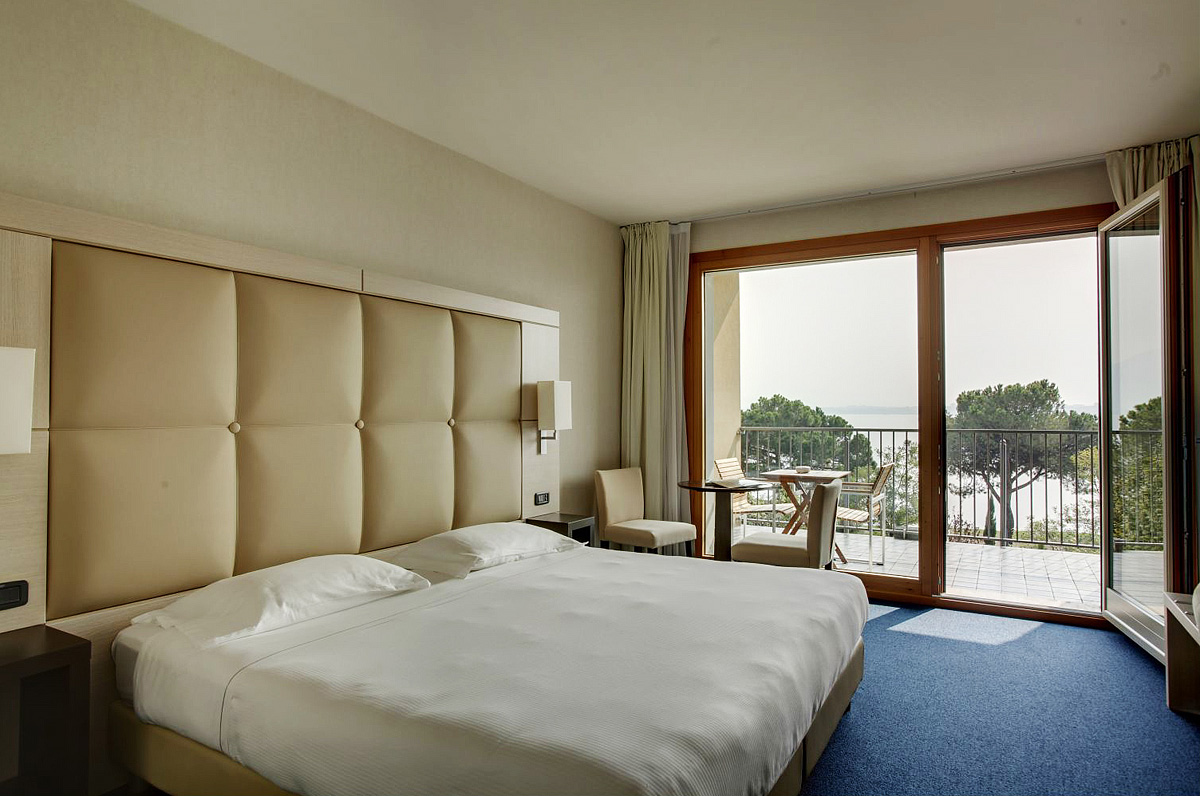 Junior Suite 2/3 - ok 30 m² - pokój z łózkiem małżeńskim lub 2 pojedyńczymi łózkami, młazienka z wanną lub prysznicem, balkon z widokiem na jezioro; 3. lózko w formie stałego łózka znajduje się na III piętrze