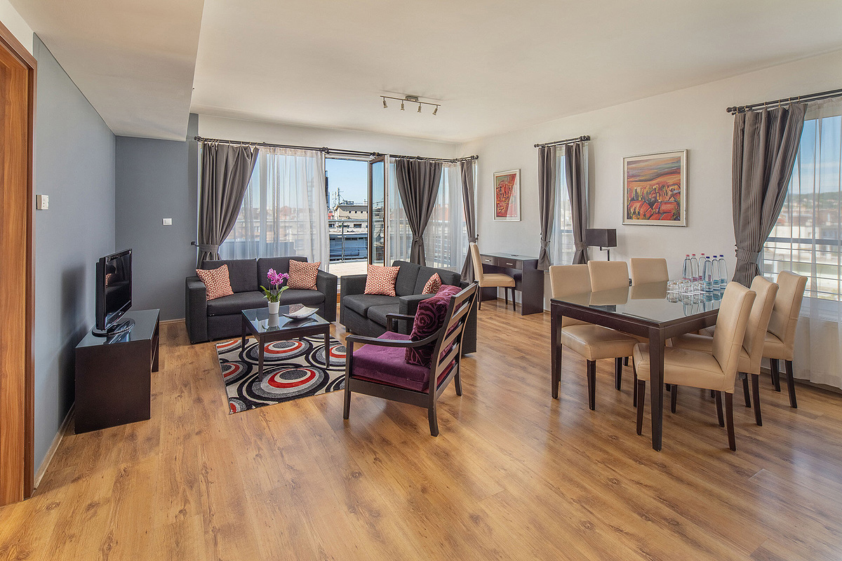 Executive Suite 5 - 75 m² - salon z aneksem kuchennym i rozkładaną sofą dla 5. osoby dorosłej, 2 sypialnie z łóżkiem małżeńskim (180×200 cm) i wspólnym kocem, łazienka; maksymalna liczba osób: 5 dorosłych