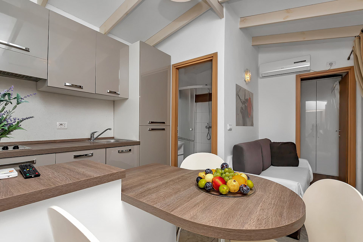 24 m² -1 sypialnia z łóżkiem małżeńskim, 1 sypialnia z 2 łóżkami pojedynczymi, pokój dzienny z w pełni wyposażonym aneksem kuchennym, łazienka z prysznicem, zadaszony taras z meblami ogrodowymi