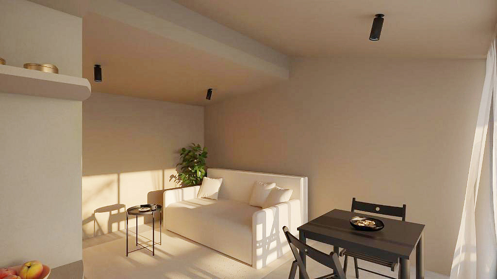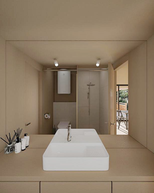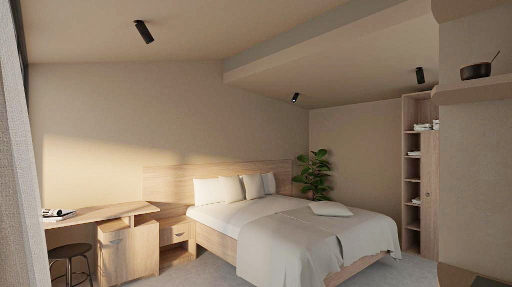 sypialnia z łóżkiem małżeńskim, pokój dzienny z aneksem kuchennym i rozkładaną kanapą dla 2 dzieci do lat 18, łazienka z prysznicem, taras
