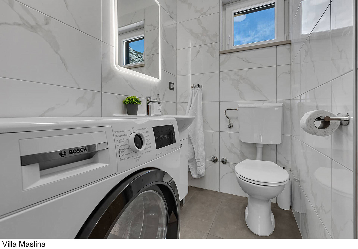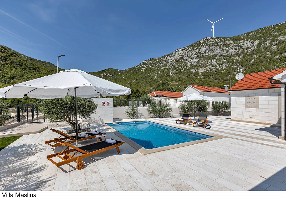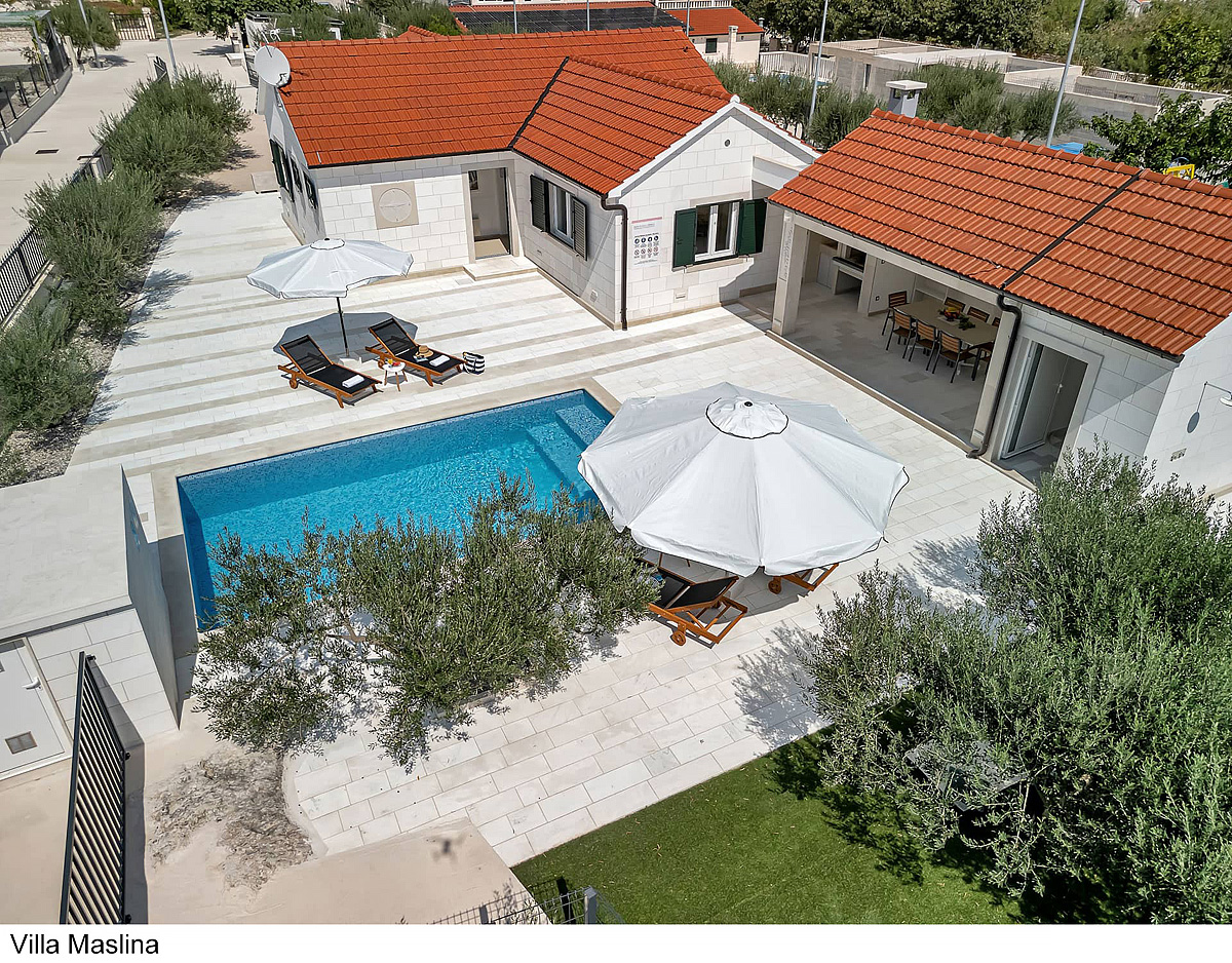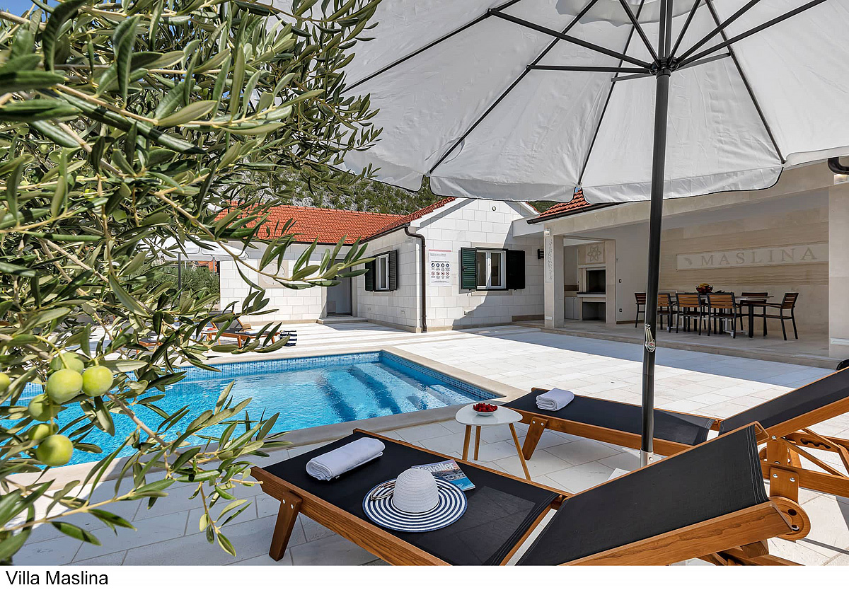 Villa Maslina 6+2 - 3 sypialnie z łóżkiem małżeńskim lub dwoma oddzielnymi łóżkami, pokój dzienny z kuchnią i rozkładaną kanapą dla dwójki dzieci do nieukończonych 18 lat, 2 łazienki z prysznicem, jedna oddzielna toaleta, taras z częścią wypoczynkową i grillem, prywatny basen z leżakami i parasolami