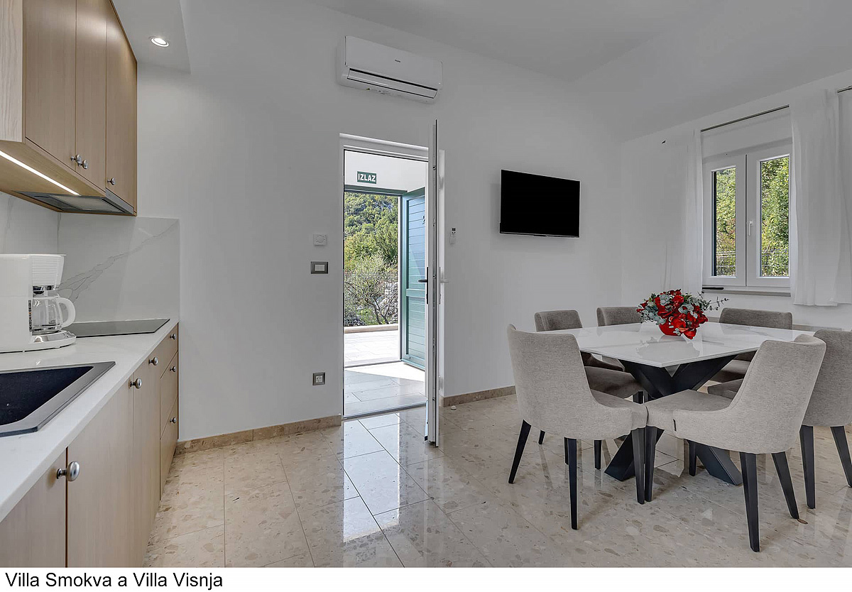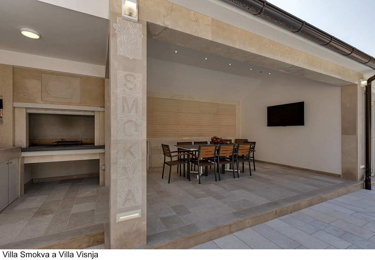 Villa Smokva 6+2 a Villa Visnja 6 - wille wynajmowane są jako całość dla większej liczby gości, Villa Smokva – 3 sypialnie z łóżkiem małżeńskim lub dwoma oddzielnymi łóżkami, pokój dzienny z kuchnią i rozkładaną kanapą dla dwójki dzieci do nieukończonych 18 lat, 2 łazienki z prysznicem, jedna oddzielna toaleta, Villa Visnja – 3 sypialnie z łóżkiem małżeńskim lub dwoma oddzielnymi łóżkami, pokój dzienny z kuchnią, 2 łazienki z prysznicem, wspólny taras z częścią wypoczynkową i grill, wspólny prywatny basen z leżakami i parasolami