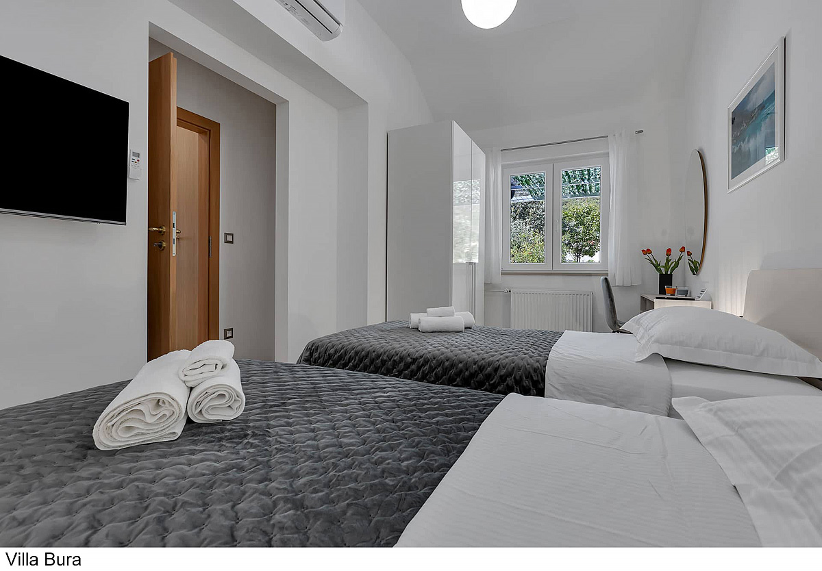 Villa Bura 6+2 - 3 sypialnie z łóżkiem małżeńskim lub dwoma oddzielnymi łóżkami, pokój dzienny z kuchnią i rozkładaną kanapą dla 2 dzieci do nieukończonych 18 lat, 2 łazienki z prysznicem, jedna oddzielna toaleta, taras z częścią wypoczynkową i grillem, prywatny basen z leżakami i parasolami