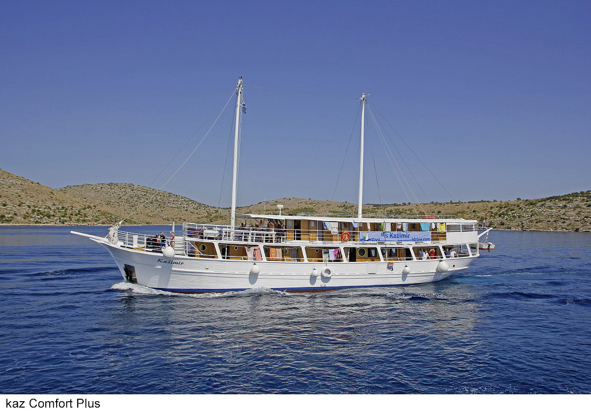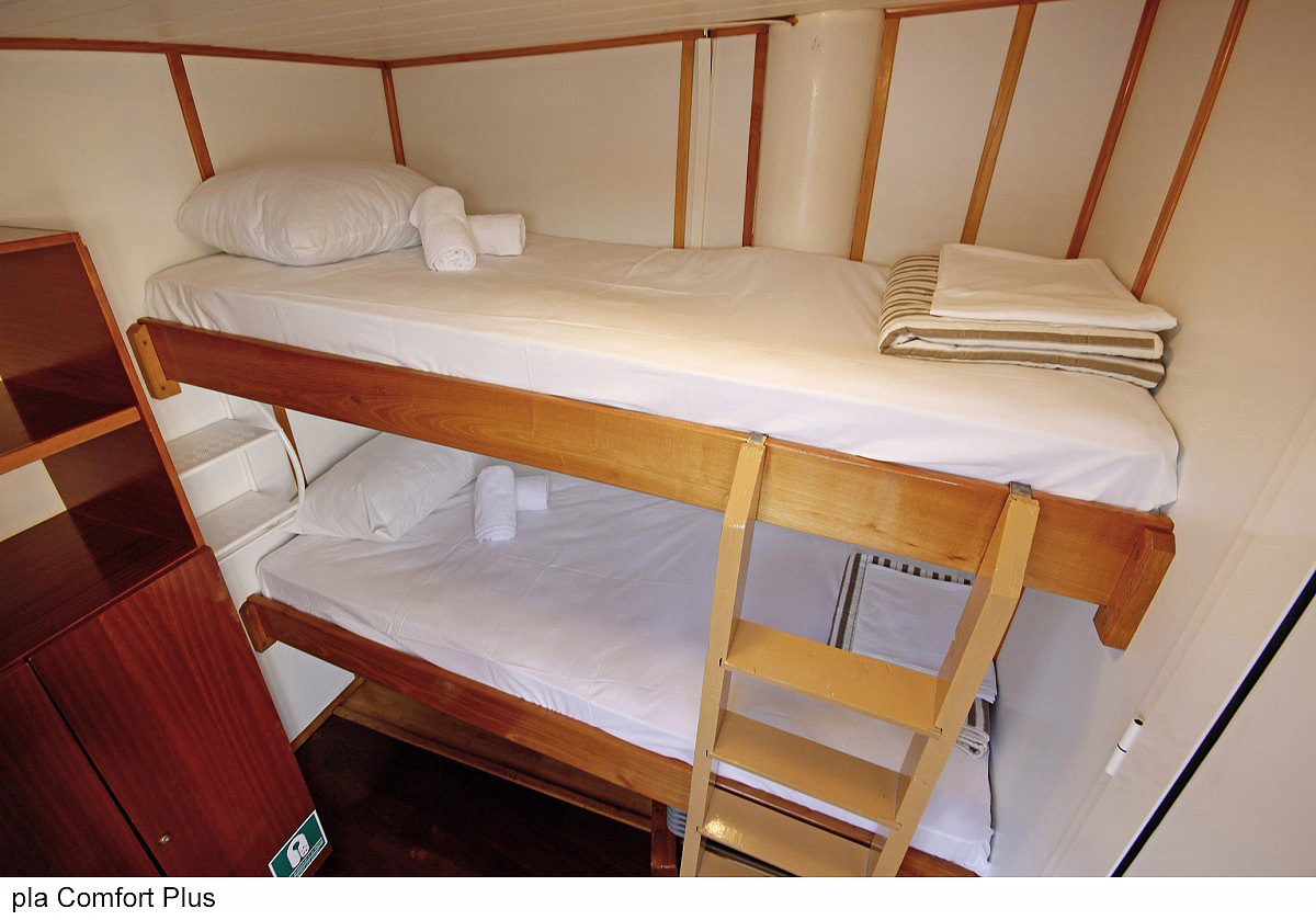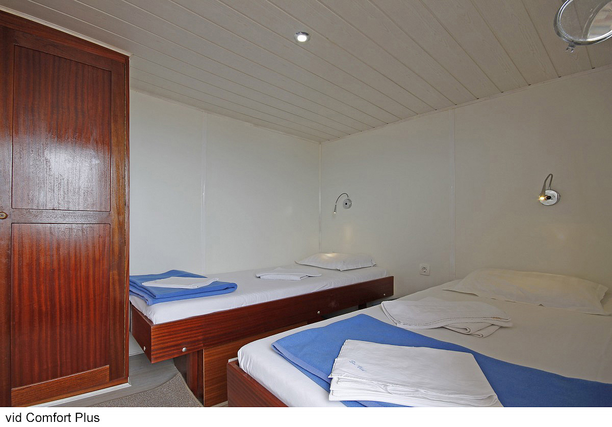 Łodzie kategorii Comfort plus / żaglówki motorowe z drewnianymi lub stalowymi kadłubami, łodzie kategorii Deluxe / luksusowe jachty motorowe ze stalowymi kadłubami, zadaszonym salonem na górnym pokładzie i platformą kąpielową na rufie. Rezerwacji kabiny na pokładzie można dokonać za dodatkową opłatą i wyłącznie po wcześniejszym zgłoszeniu. W kategorii Comfort plus woda z prysznica spływa do odpływu podłogowego, nie jest to kabina prysznicowa i nie jest oddzielona zasłoną.