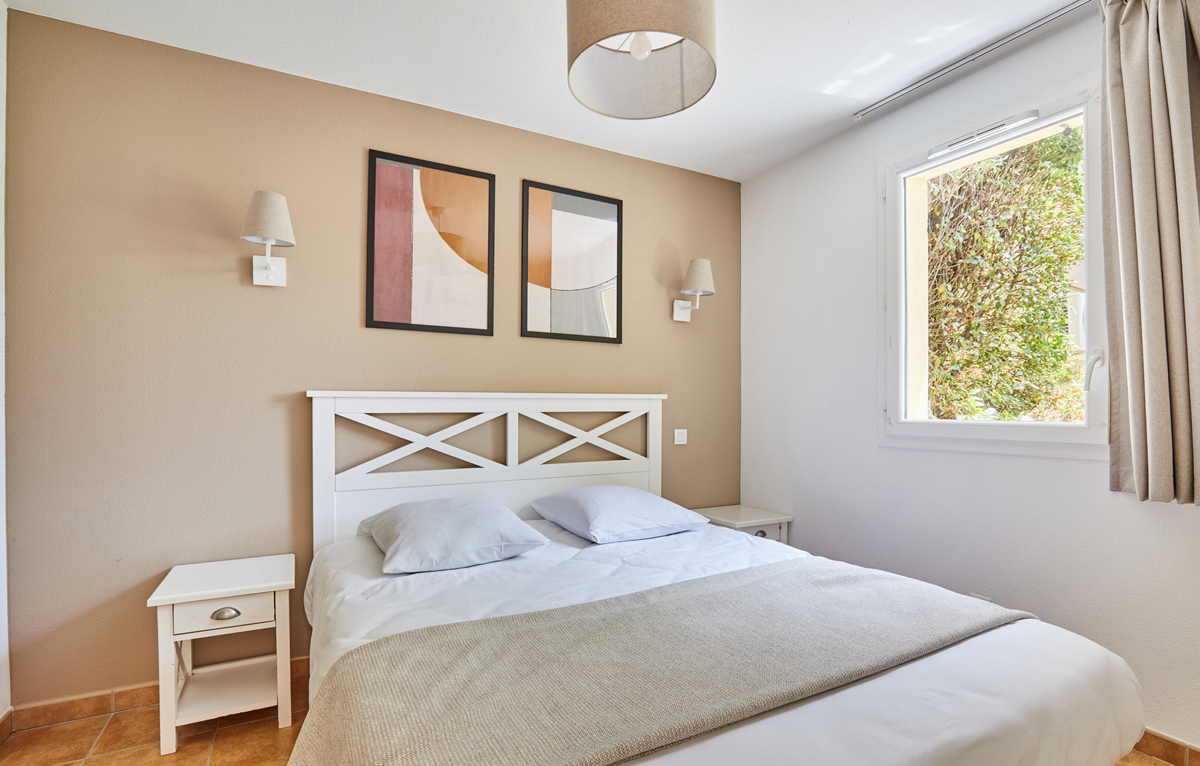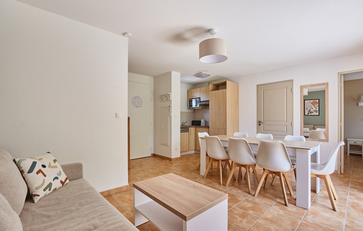 43 m² – pokój dzienny z aneksem kuchennym i rozkłądana kanapa dla 2 osób (możliwy typ "szuflada") sypialnia z łozkiem małżeńskim, sypialnia z 2 pojedyńczymi łózkami, łazienka, osobno WC, taras;