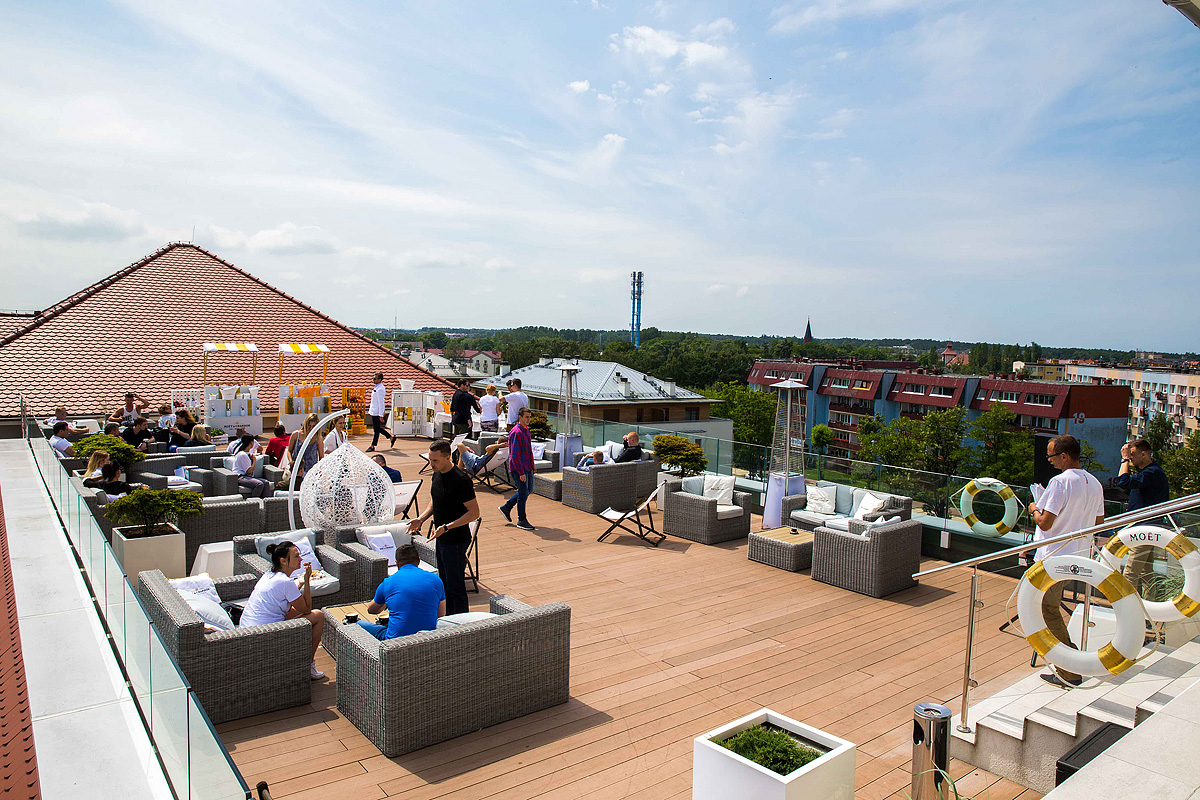 basen 1 143 m², basen zewnętrzny 200 m², basen z wodą termalną, basen dla dzieci, kąpiel solna, sauna fińska, biosauna, łaźnia parowa, sanarium, kabina na podczerwień, jaskinia solna, kącik relaksacyjny z leżakami, masaże*, usługi kosmetyczne*, siłownia ze strefą cardio, ogród z leżakami i parasolami, piłkarzyki, bilard*, squash*, kort tenisowy*, tenis stołowy, kręgielnia*, wypożyczalnia rowerów*