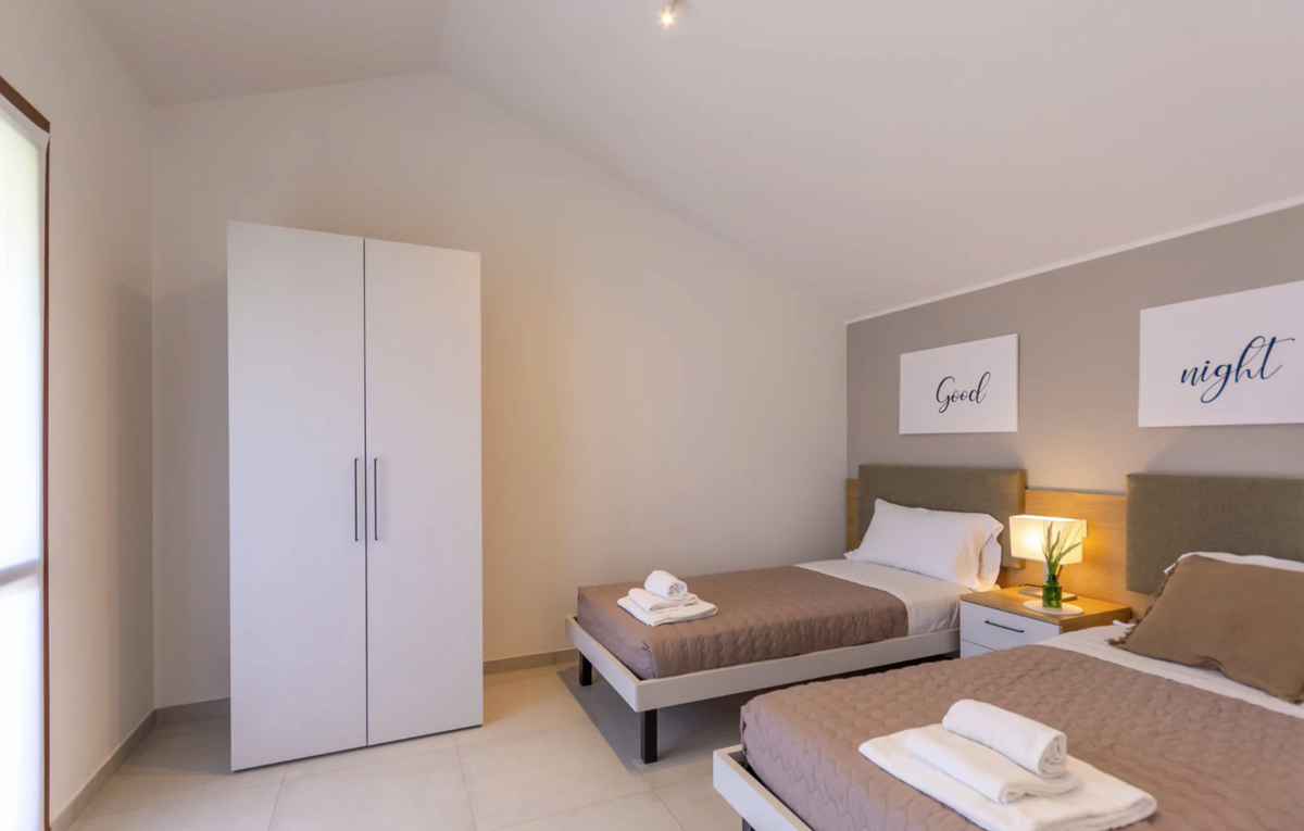 100 m² – połowa parterowej willi; parter: 1 sypialnia z łóżkiem małżeńskim, salon z aneksem kuchennym, łazienka z prysznicem, weranda z kominkiem i grillem, ogród z prywatnym basenem; piętro: 1 sypialnia z łóżkiem małżeńskim, 1 sypialnia z 2 łóżkami pojedynczymi lub łóżkiem piętrowym, łazienka z prysznicem; 2 miejsca parkingowe przy domu; na życzenie możliwość dostawki dla 7. osoby*