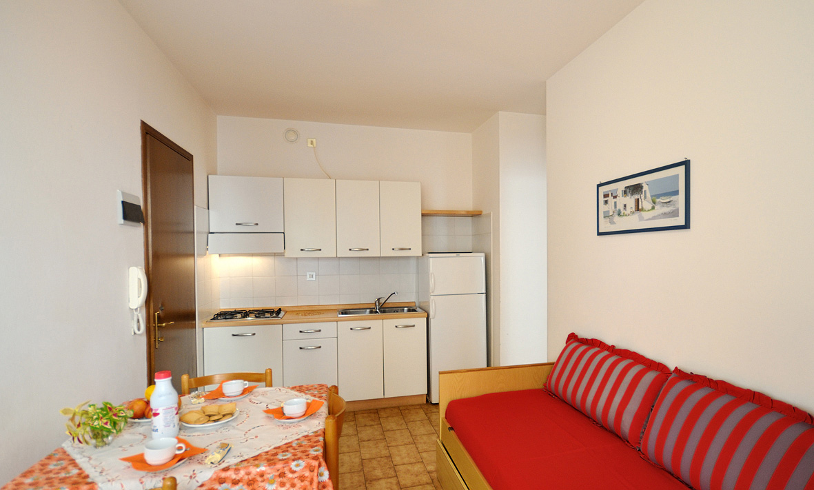 50 m² - 2 sypialnie z 2 pojedynczymi łóżkami, salon z oddzielnym aneksem kuchennym i rozkładaną kanapą (możliwość typu "szuflada") dla 2 osób, łazienka z prysznicem, balkon