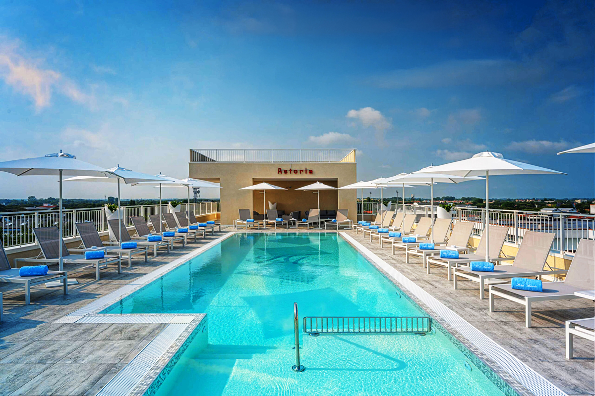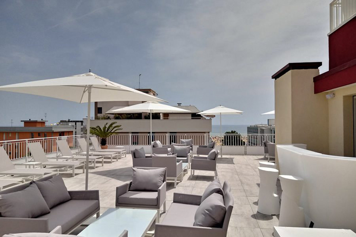 panoramiczny basen na dachu z leżakami i parasolami, taras słoneczny, serwis plażowy na prywatnej plaży (w cenie 2 leżaki + parasol lub 2 leżaki + altana plażowa/pokój); wypożyczalnia rowerów, ręcznik basenowy*