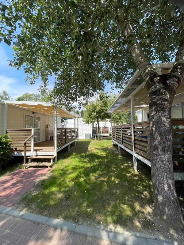 29 m² - sypialnia z łóżkiem małżeńskim, 2 sypialnie z 2 łóżkami pojedynczymi, pokój dzienny z aneksem kuchennym i rozkładaną kanapą dla 1 osoby, łazienka z prysznicem, częściowo zadaszony drewniany taras z miejscem do siedzenia na zewnątrz.