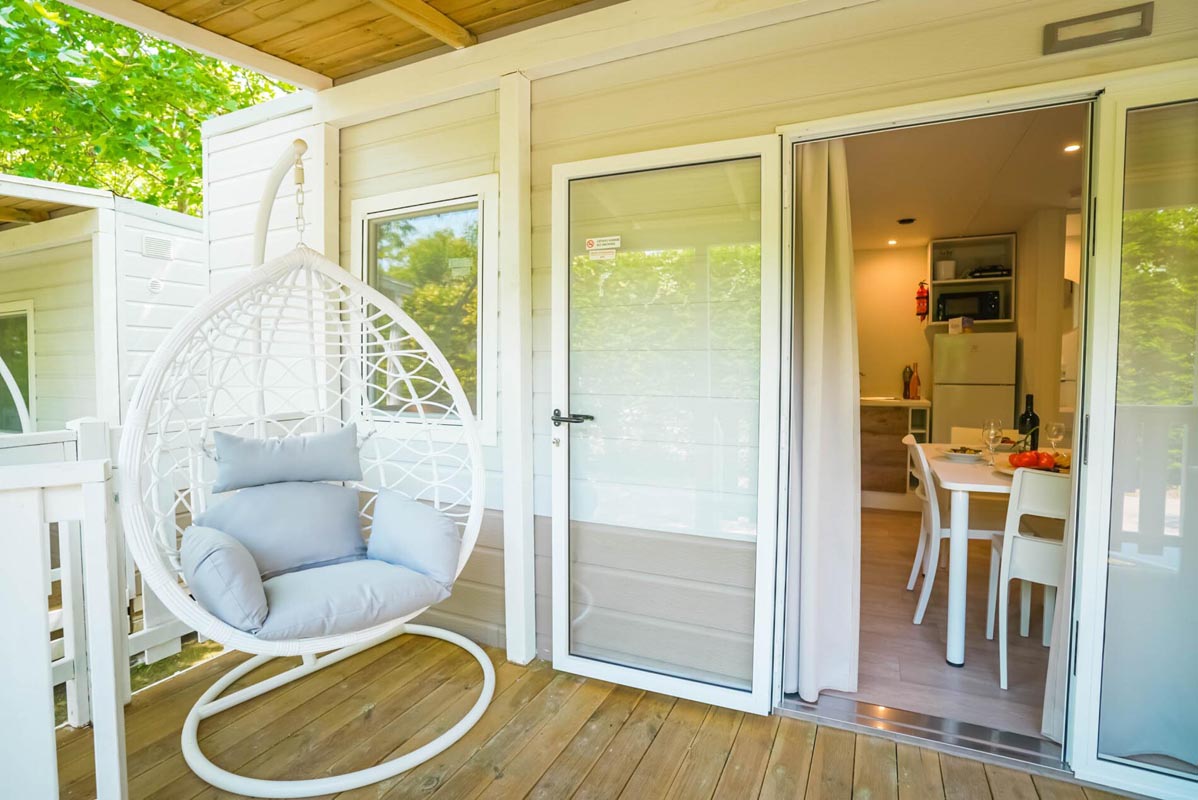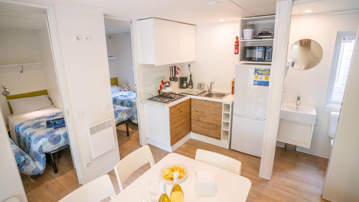 29 m² - sypialnia z łóżkiem małżeńskim, 2 sypialnie z 2 łóżkami pojedynczymi, salon z aneksem kuchennym i rozkładaną sofą dla 1 osoby, łazienka z prysznicem, częściowo zadaszony drewniany taras z miejscami do siedzenia na zewnątrz