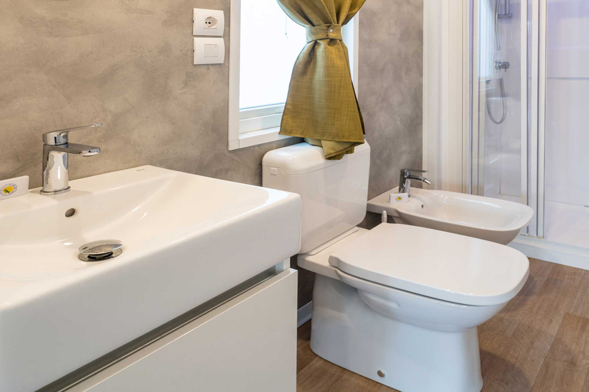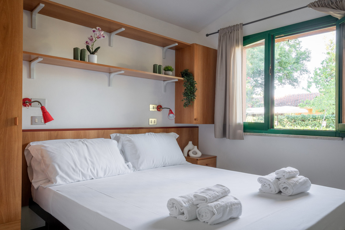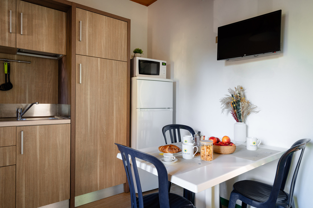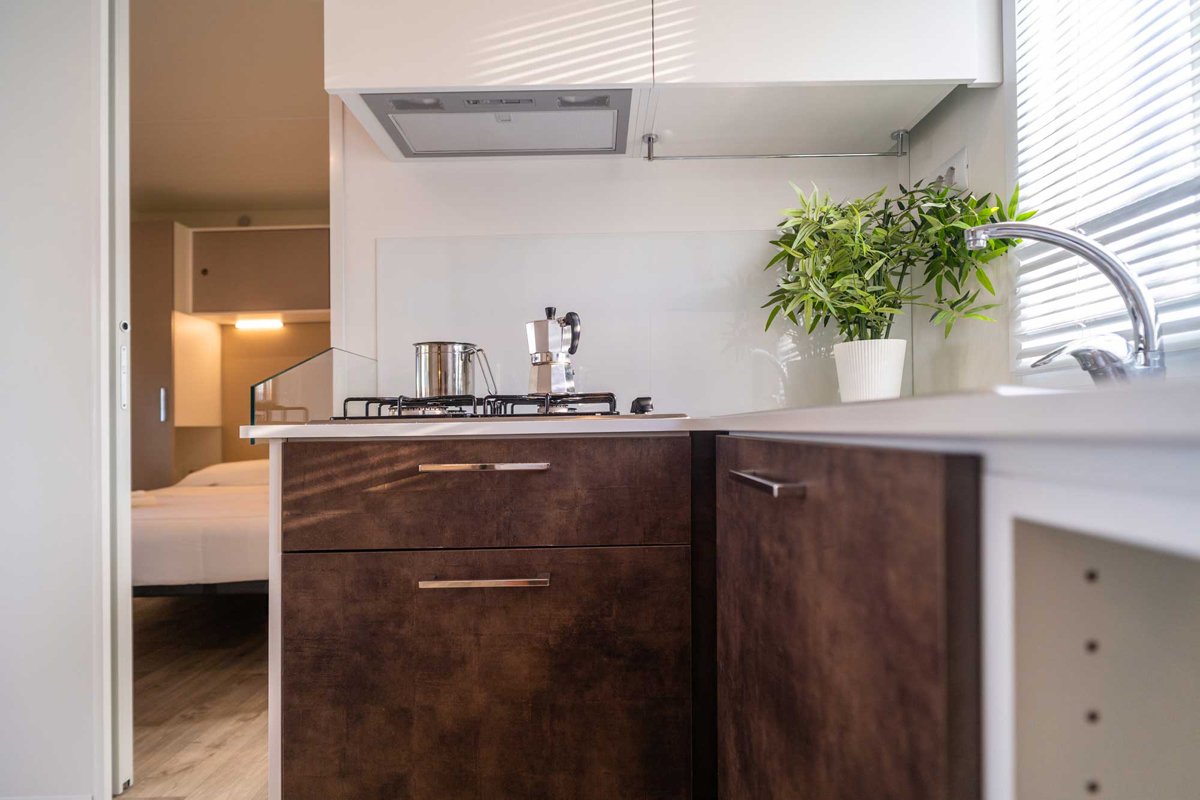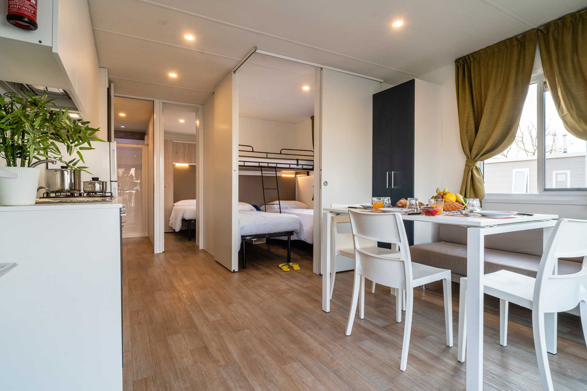 mobilhome Comfort 4+1 - 32 m² - 1 sypialnia z łóżkiem małżeńskim, 1 sypialnia z 2 łóżkami pojedynczymi i 1 łóżkiem wiszącym dla dziecka do 9,99 lat, pokój dzienny z aneksem kuchennym, łazienka z prysznicem, zadaszony taras drewniany