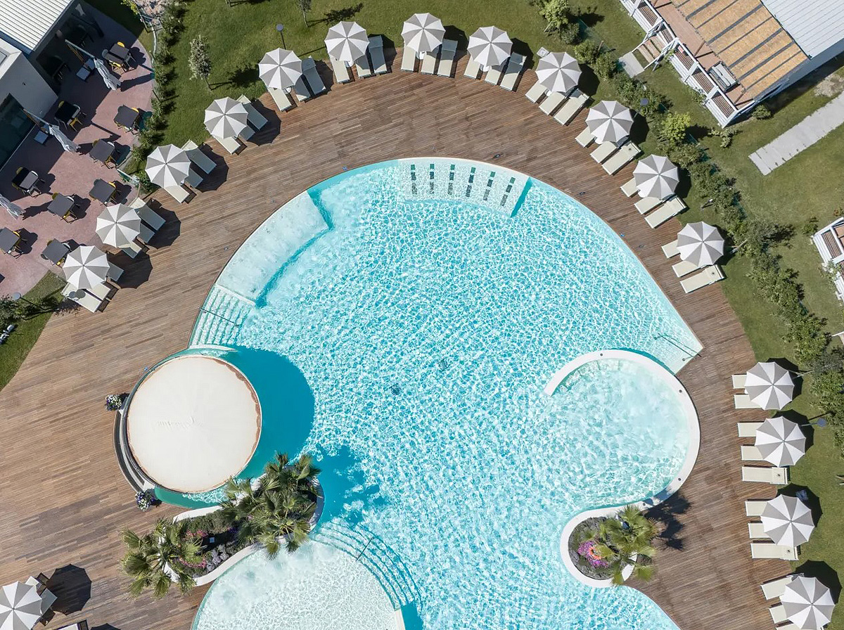 basen z dyszami do hydromasażu, basen dla dzieci ze zjeżdżalniami, parasolami* i leżakami* (wszystko od około końca maja do połowy września), basen dla psów*, wypożyczalnia rowerów*, miejsce do konserwacji i mycia rowerów, zakontraktowana plaża*: siatkówka plażowa, tenis plażowy, tenis stołowy