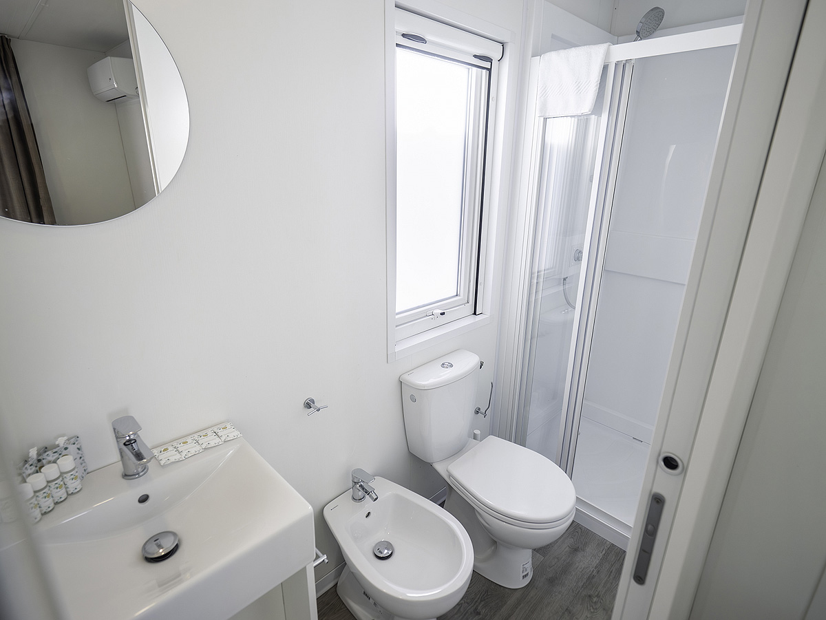 35 m² - sypialnia z łózkiem małżeńskim, sypialnia z 2 ppojedyńczymi łóżkami, pokój dzienny z aneksem kuchennym, 2 łazienki z prysznicem, taras, prysznic zewnętrznym