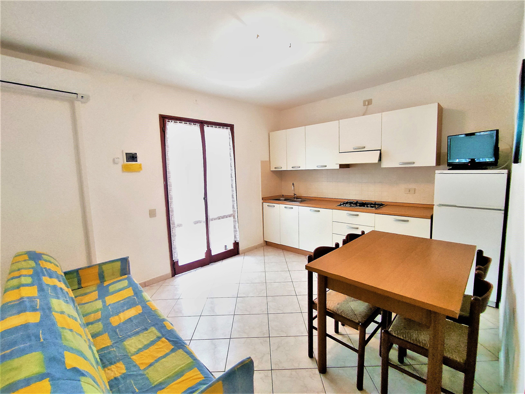 bilo 4 A - 30 m² - 1 sypialnia z łóżkiem małżęńskim, pokój dzienny z aneksem kuchennym i kanapą rozkładaną dla 2 osób, łazienka z prysznicem, balkon lub taras lub taras z ogródkiem od frontu