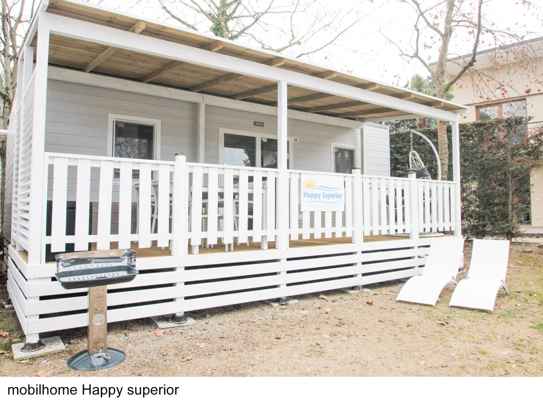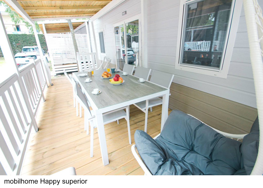 mobilhome Happy easy – klimatyzacja*, mały grill elektryczny; mobilhome Happy plus i Happy Premium – klimatyzacja*, mały grill elektryczny, ekspres do kawy i kuchenka mikrofalowa; mobilhome Happy superior – klimatyzacja*, mały grill elektryczny, ekspres do kawy, kuchenka mikrofalowa, toster, suszarka do włosów