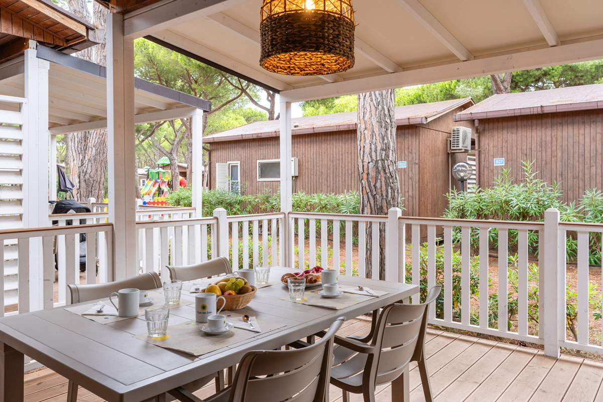 30 m² - 1 sypialnia z łóżkiem małżeńskim, 1 sypialnia z 2 łóżkami pojedynczymi i 1 łóżkiem wiszącym dla dziecka do 10 lat, pokój dzienny z aneksem kuchennym i ławą, którą można rozłożyć do spania, łazienka z prysznicem, zadaszony taras z drewna