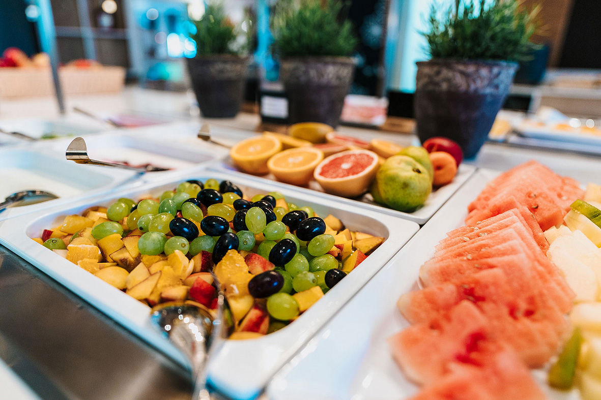 serwowane 3-daniowe menu albo bufet zimnych lub gorących przystawek, dań głównych z dodatkami, sałatek i deserów, napoje za dopłatą
