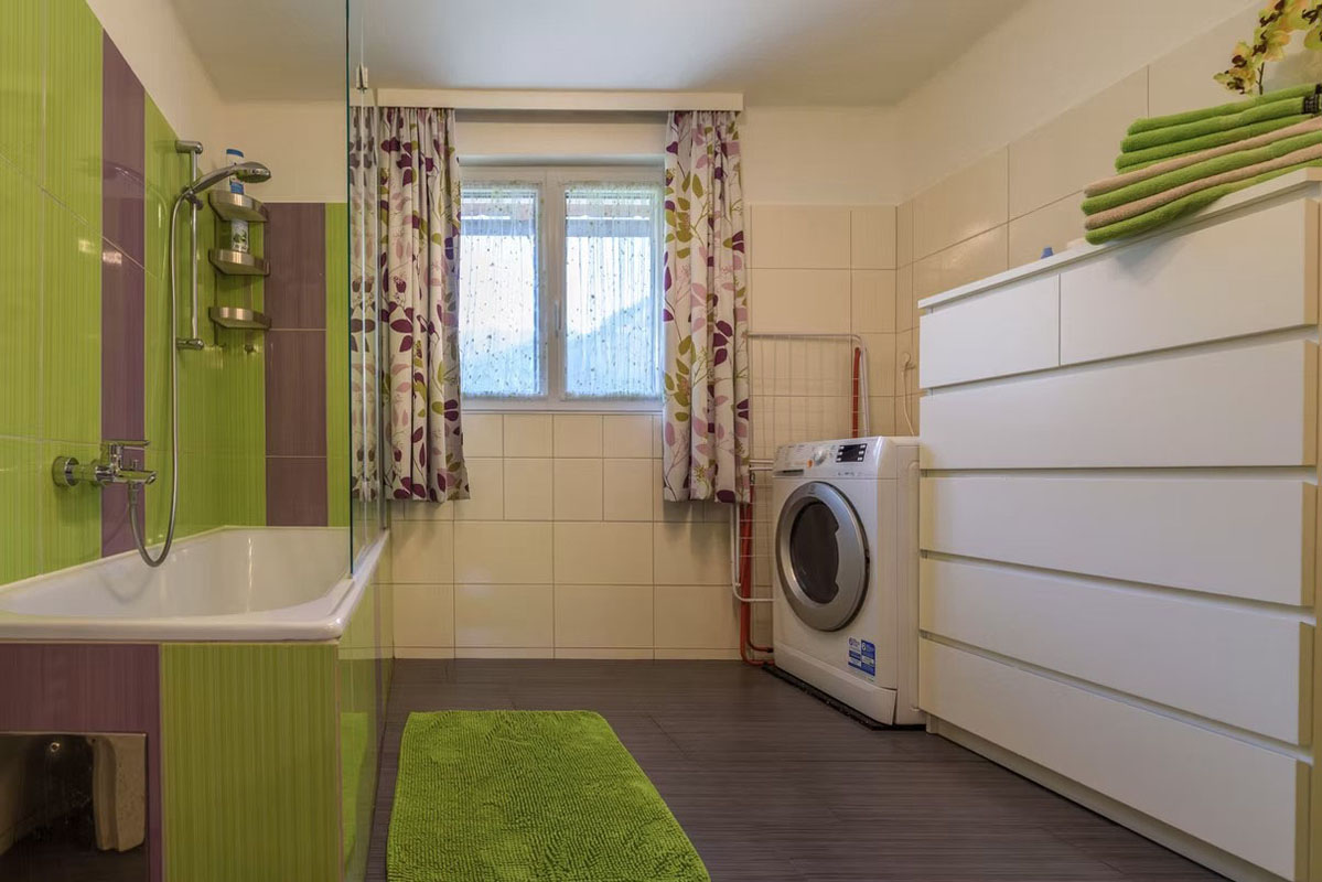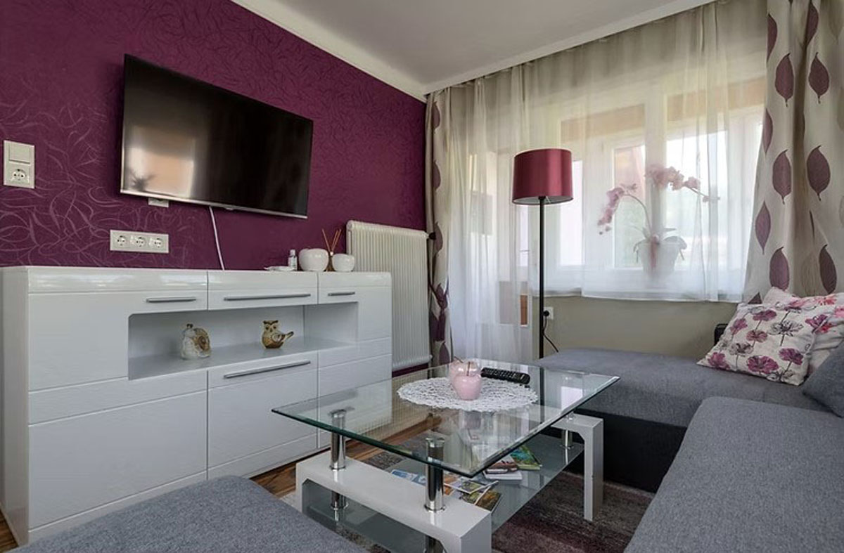 80 m² – parter apartamentu: sypialnia z łóżkiem małżeńskim i sofą, salon z rozkładaną sofą dla maksymalnie 2 osób, oddzielna kuchnia, łazienka z wanną, balkon