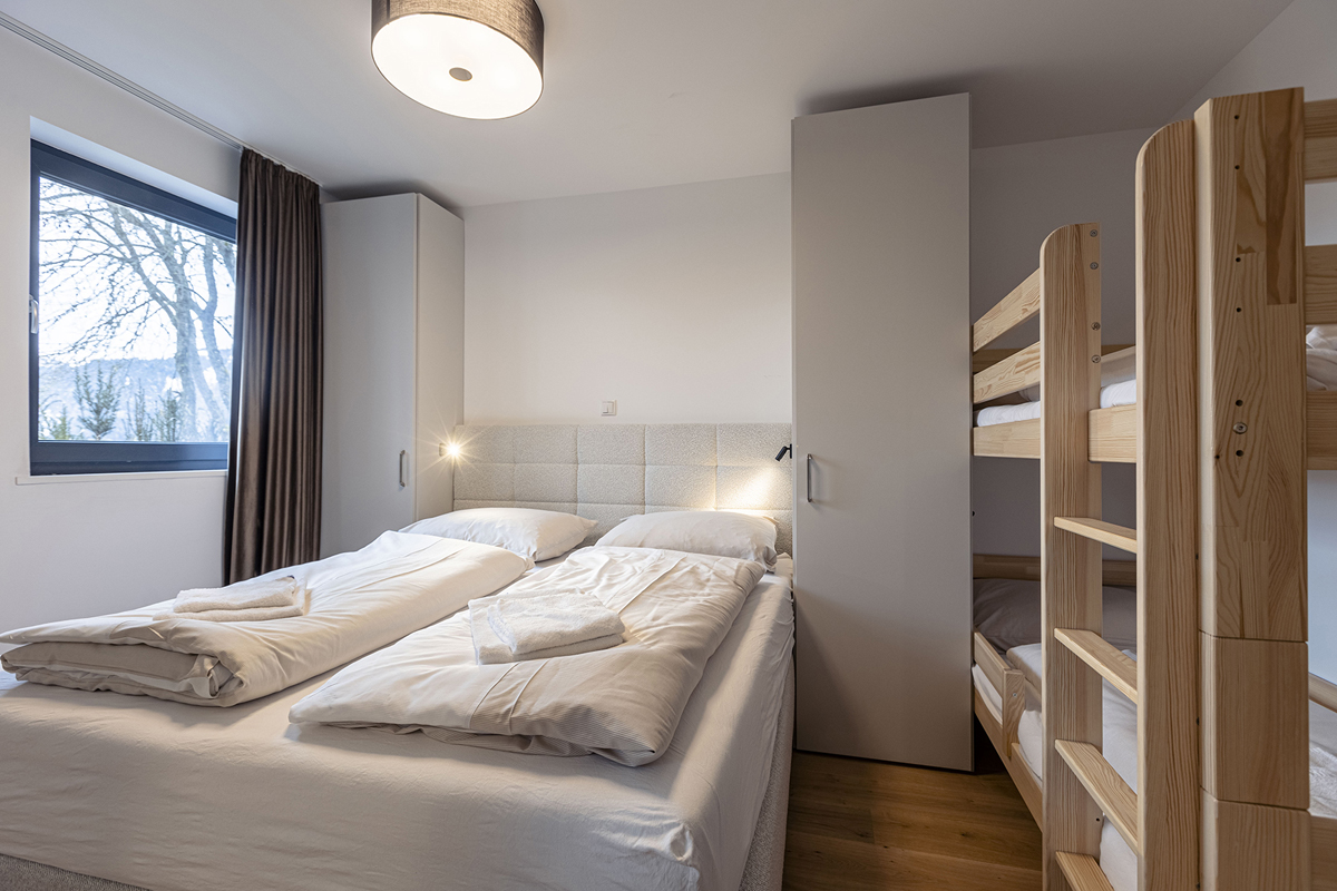 53 do 57 m² - 1 sypialnia z łóżkiem małżeńskim, sypialnia z łóżkiem małżeńskim i łóżkiem piętrowym dla 2 osób, salon z aneksem kuchennym, 2 łazienki, balkon lub taras