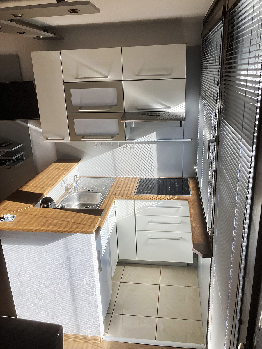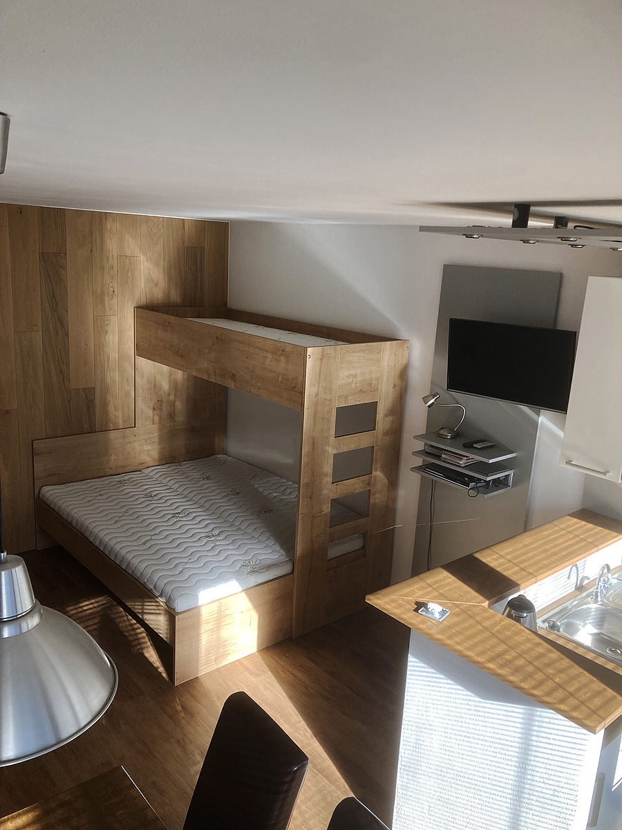 29 m² - salon z łóżkiem małżeńskim i nietypowym łóżkiem piętrowym dla 2 osób, aneks kuchenny w przedpokoju, łazienka, balkon