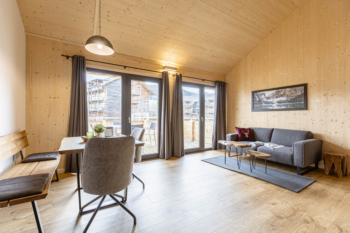 60 m² - 2 sypialnie z łóżkami małżeńskimi, otwarta sypialnia z łóżkiem małżeńskim, salon z aneksem kuchennym, łazienka, sauna na podczerwień, taras z jacuzzi
