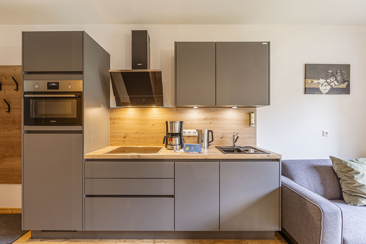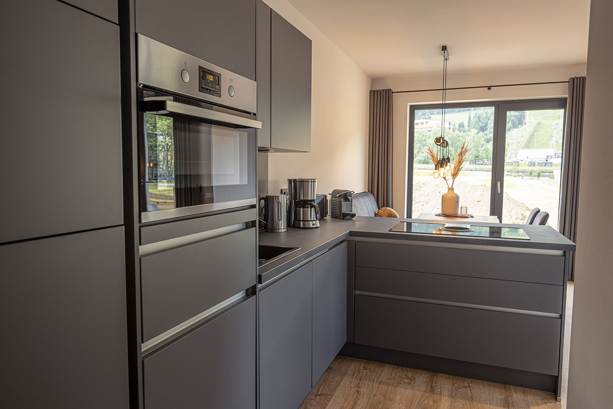 85 do 90 m² – sypialnia z łóżkiem małżeńskim i rozkładaną sofą dla 2 osób lub druga sypialnia z łóżkiem małżeńskim, salon z aneksem kuchennym i rozkładaną sofą, łazienka, balkon; 1 apartament dostępny dla osób niepełnosprawnych (tylko na życzenie)