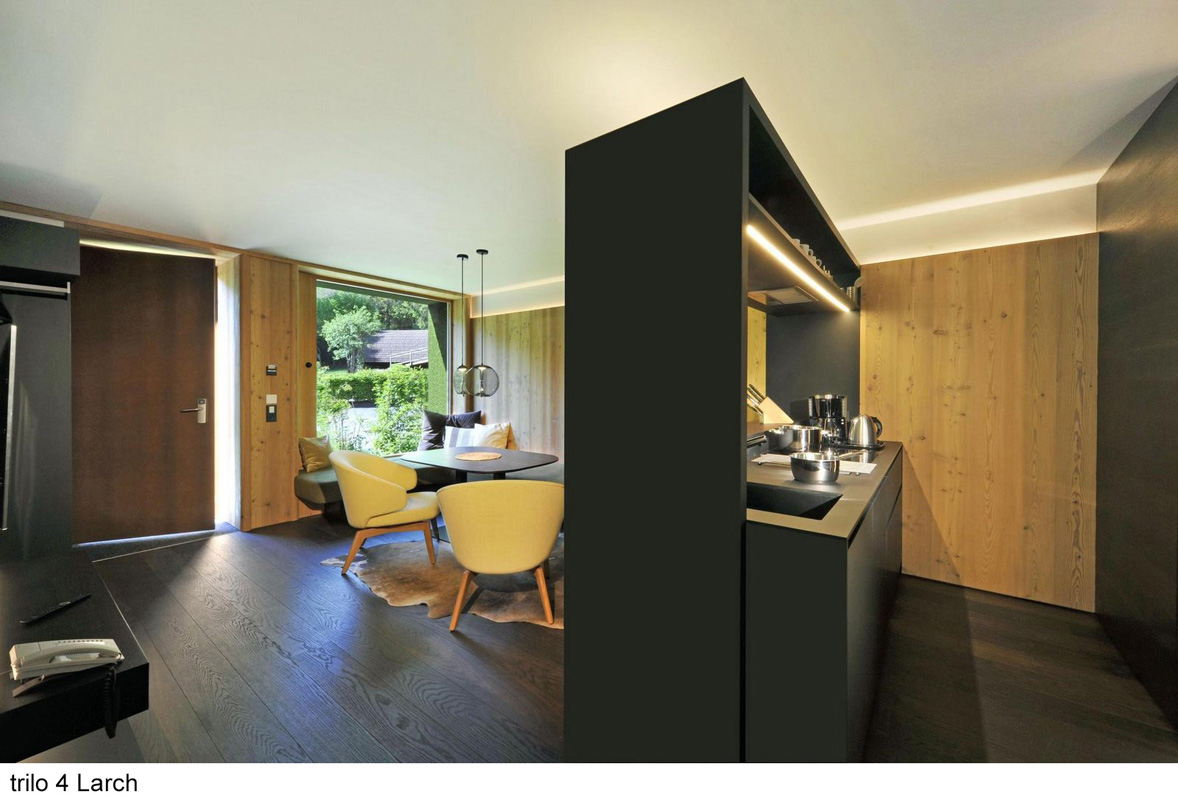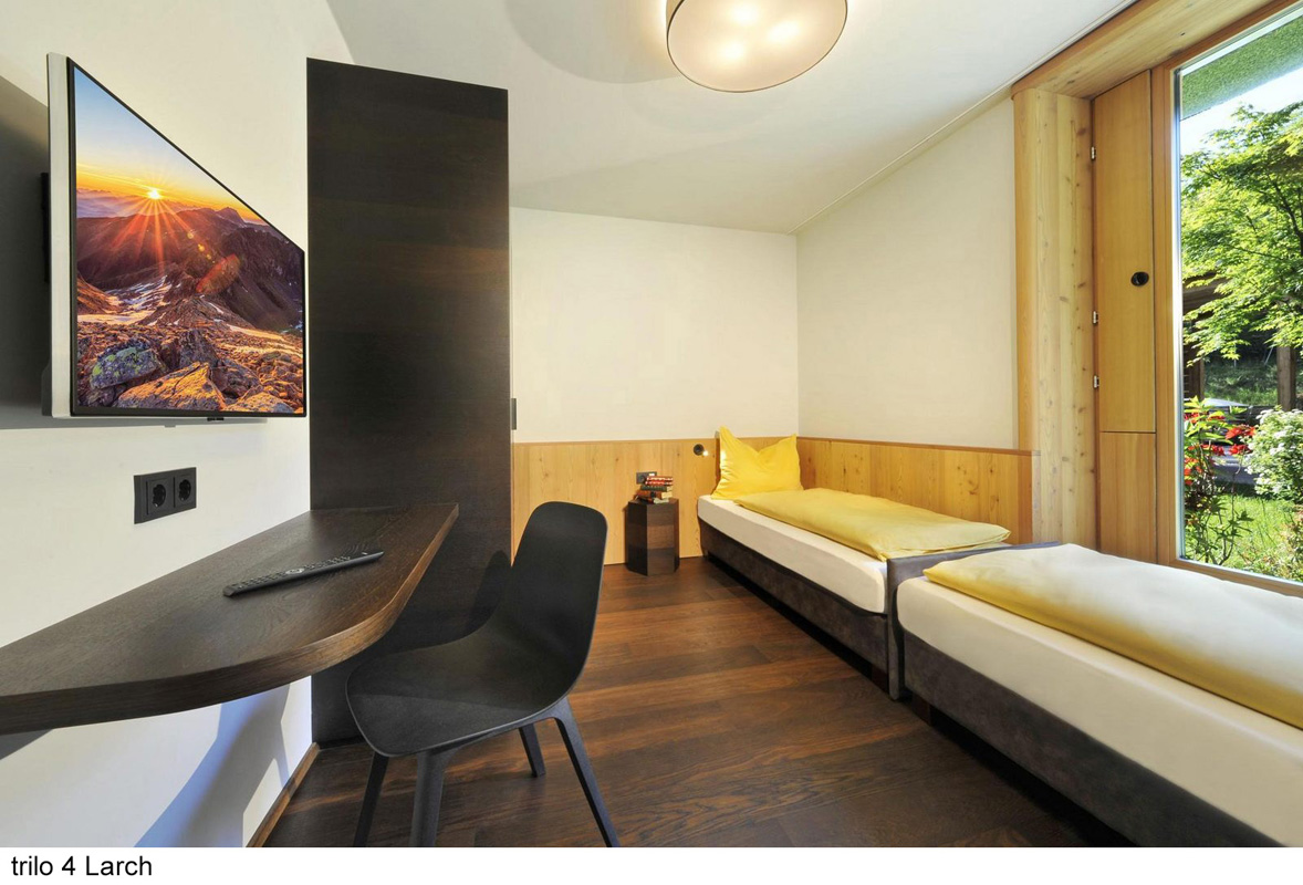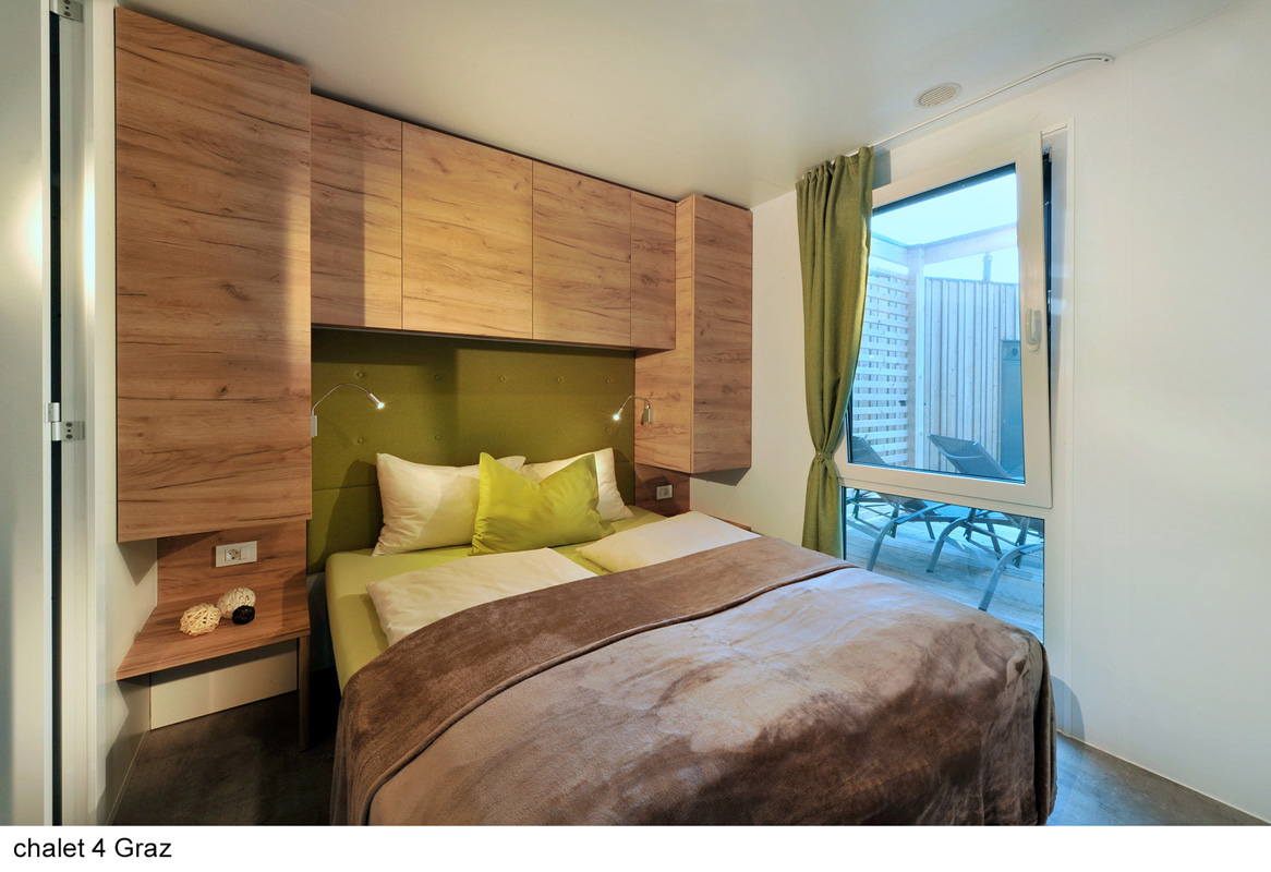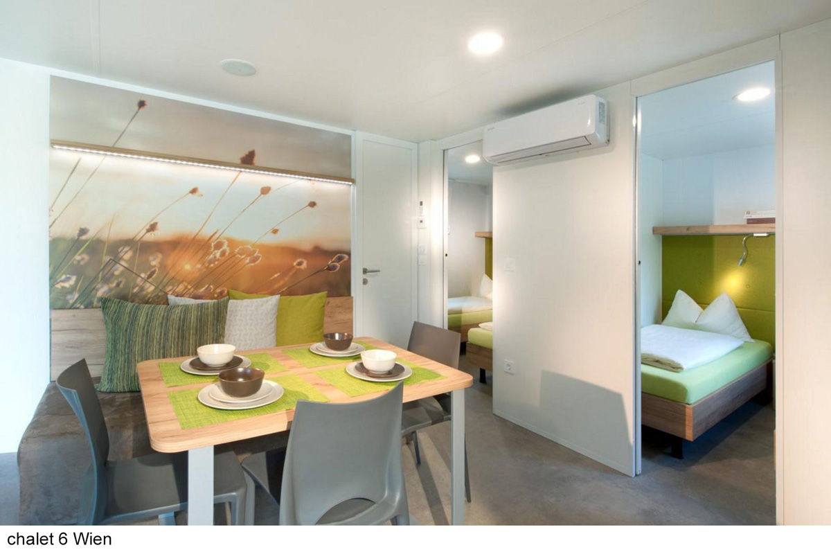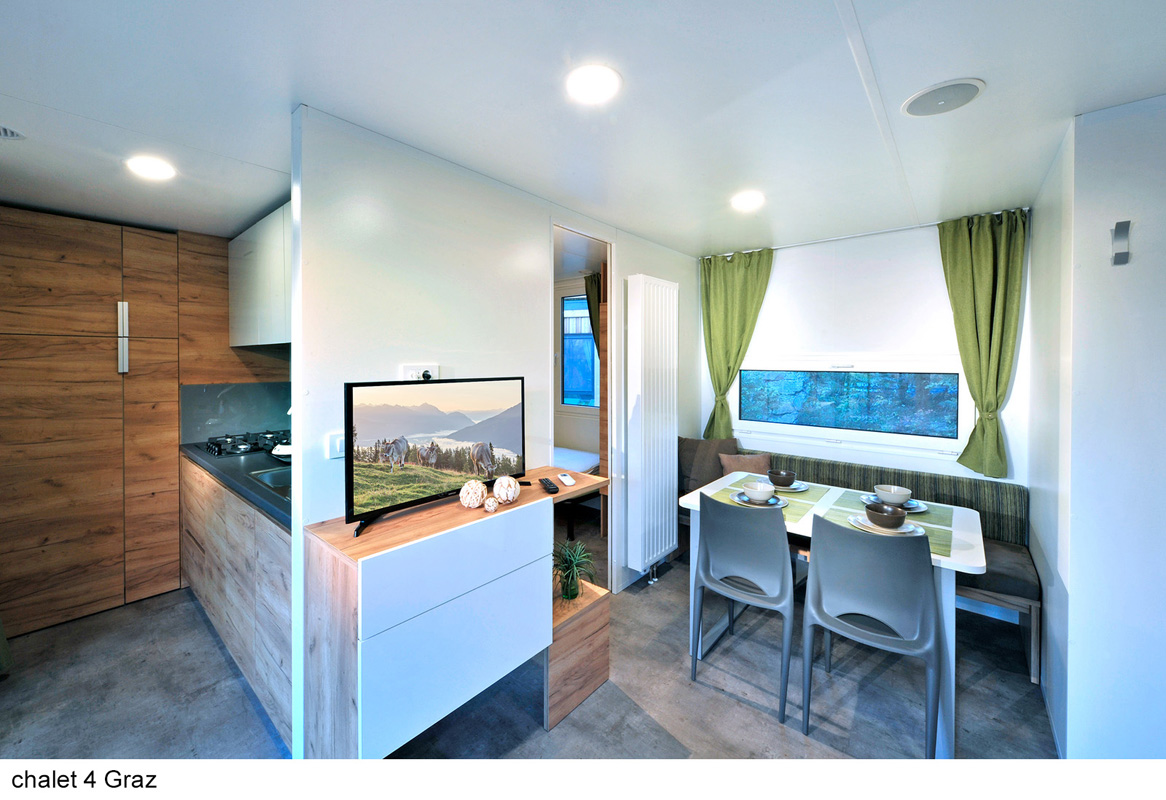 zupełnie wyjątkowy kompleks noclegowy składający się z budynków apartamentowych z trzema apartamentami: sosnowym i modrzewiowym, domkami mobilnymi lub domkami typu chalet w Grazu i Wiedniu oraz wolnostojącymi domkami z drewna: Tiny home, budynek centralny z recepcją, bistro, tarasem, salą konferencyjną, przechowalnią sprzętu narciarskiego i pokojem zabaw dla dzieci; podane odległości mierzone są od recepcji