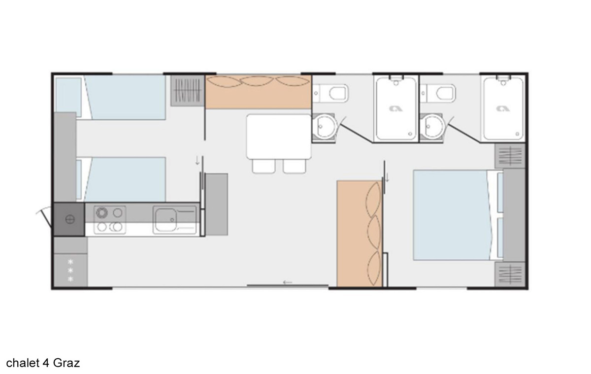 57 m² - 1 sypialnia z łóżkiem małżeńskim, sypialnia z 2 łóżkami pojedynczymi lub łóżkiem piętrowym, salon z sofą i aneksem kuchennym, 2 łazienki, 1 osobna toaleta, taras z ogródkiem przed domem, prywatne miejsce parkingowe (1 miejsce / apartament)