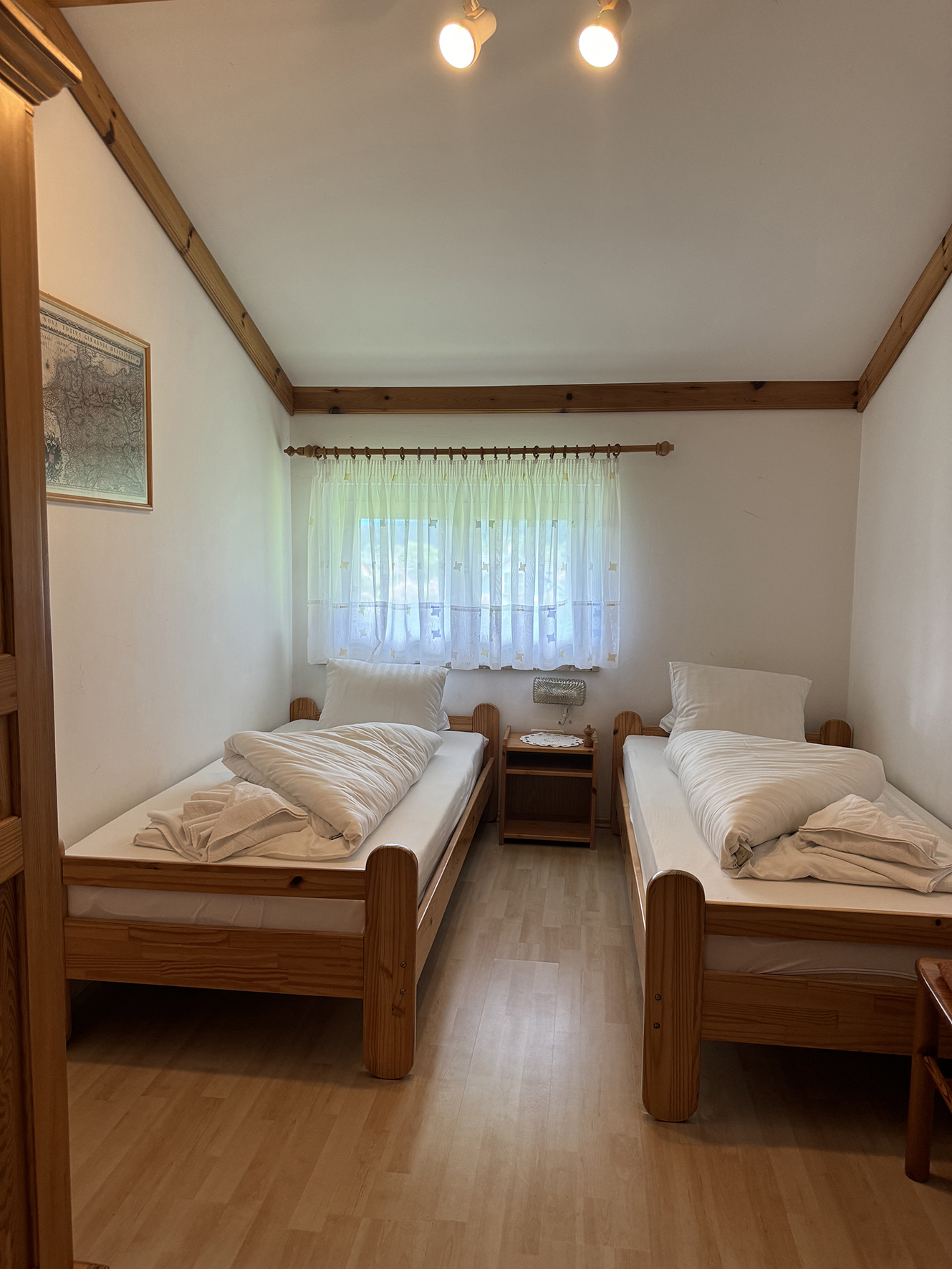 60 m² - 1 sypialnia z łóżkiem małżeńskim, sypialnia z 2 łóżkami pojedynczymi, salon z aneksem kuchennym i rozkładaną sofą (szerokość 180 cm) dla 2 osób, łazienka z prysznicem lub wanną, osobna toaleta, taras; Mieszkanie znajduje się na parterze.