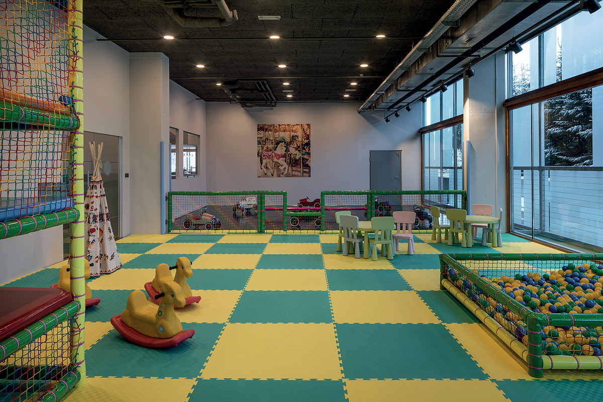 architektonicznie ciekawy hotel przy dolnej stacji kolejki linowej, zewnętrzny podgrzewany basen Infiniti połączony z basenem wewnętrznym oraz zupełnie niekonwencjonalne kryte rampy i prywatna przechowalnia sprzętu narciarskiego tuż przed każdym pokojem