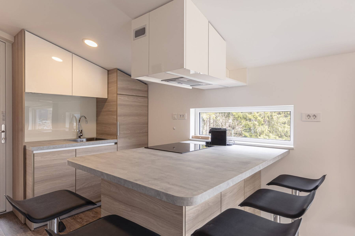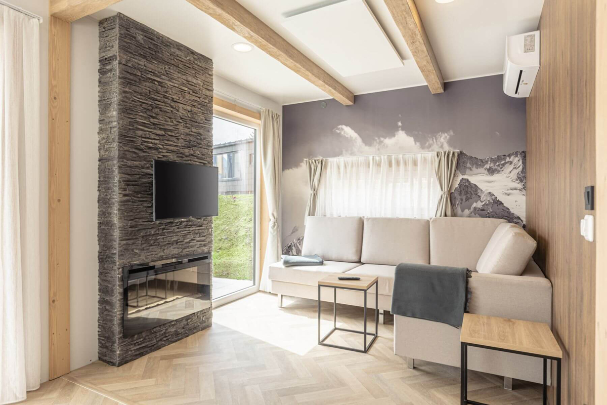 22,5 m² - salon z aneksem kuchennym, łóżkiem małżeńskim i rozkładaną sofą dla 1 dziecka do lat 13, łazienka, taras; apartament stoi na wysokich filarach, dostęp do niego możliwy jest wyłącznie po schodach