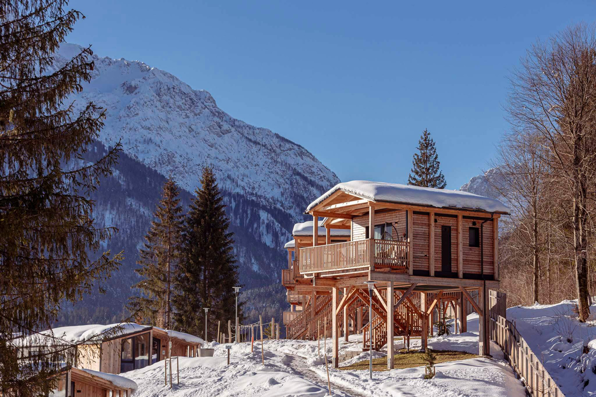 Wioska wakacyjna z domkami i nietypowymi apartamentami na wysokich filarach z zapierającym dech w piersiach widokiem na okolicę