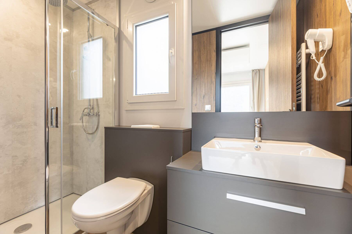 60 m² - 3 sypialnie z łóżkiem małżeńskim lub 2 łóżkami pojedynczymi lub łóżkiem piętrowym dla 2 osób (zwykle 1 łóżko małżeńskie, 1 łóżko piętrowe i 1 sypialnia z 2 łóżkami pojedynczymi), salon z aneksem kuchennym, łazienka, osobna toaleta, taras