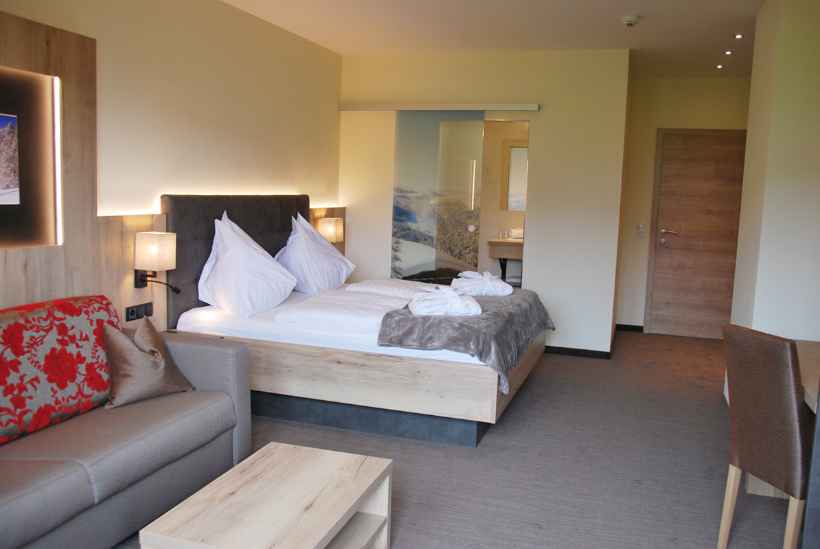 pokój z łóżkiem małżeńskim lub 1 pojedynczym łóżkiem, łazienka, zwykle balkon lub taras