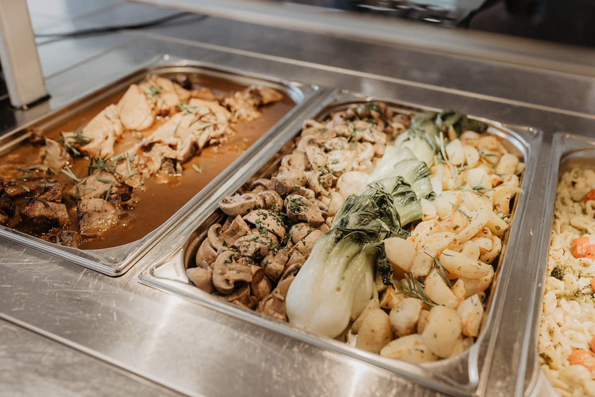 w formie bufetu, wybór dań głównych z dodatkami, przystawka lub zupa, sałatki, deser, napoje za opłatą