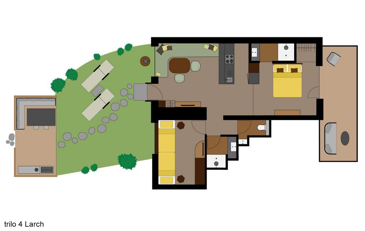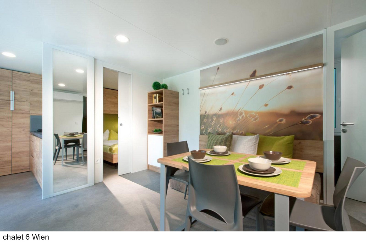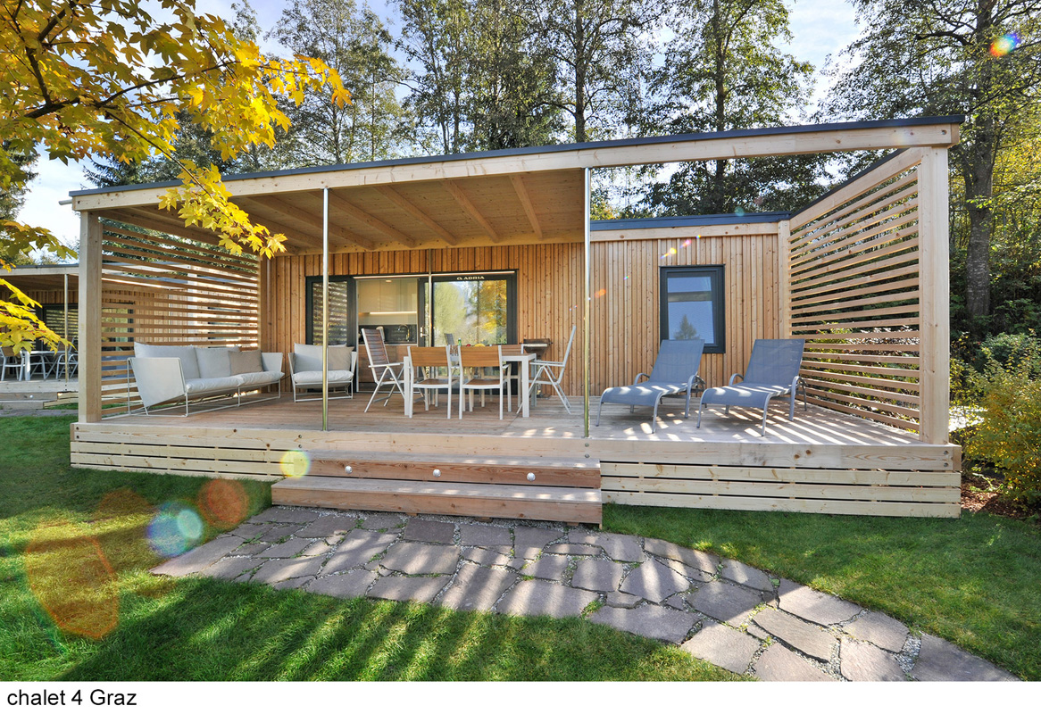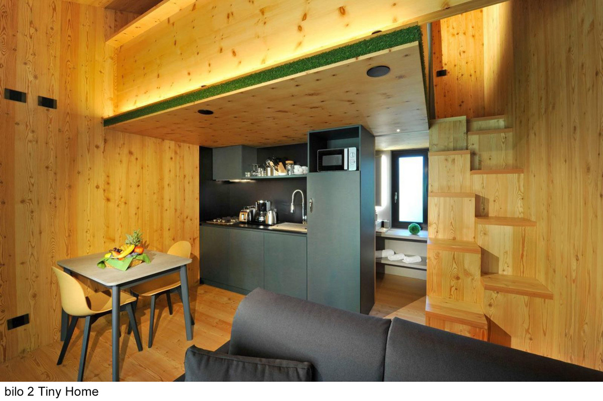zupełnie wyjątkowy kompleks noclegowy składający się z budynków apartamentowych z trzema apartamentami: sosnowym i modrzewiowym, domkami mobilnymi lub domkami typu chalet w Grazu i Wiedniu oraz wolnostojącymi domkami z drewna: Tiny home, budynek centralny z recepcją, bistro, tarasem, salą konferencyjną, przechowalnią sprzętu narciarskiego i pokojem zabaw dla dzieci; podane odległości mierzone są od recepcji