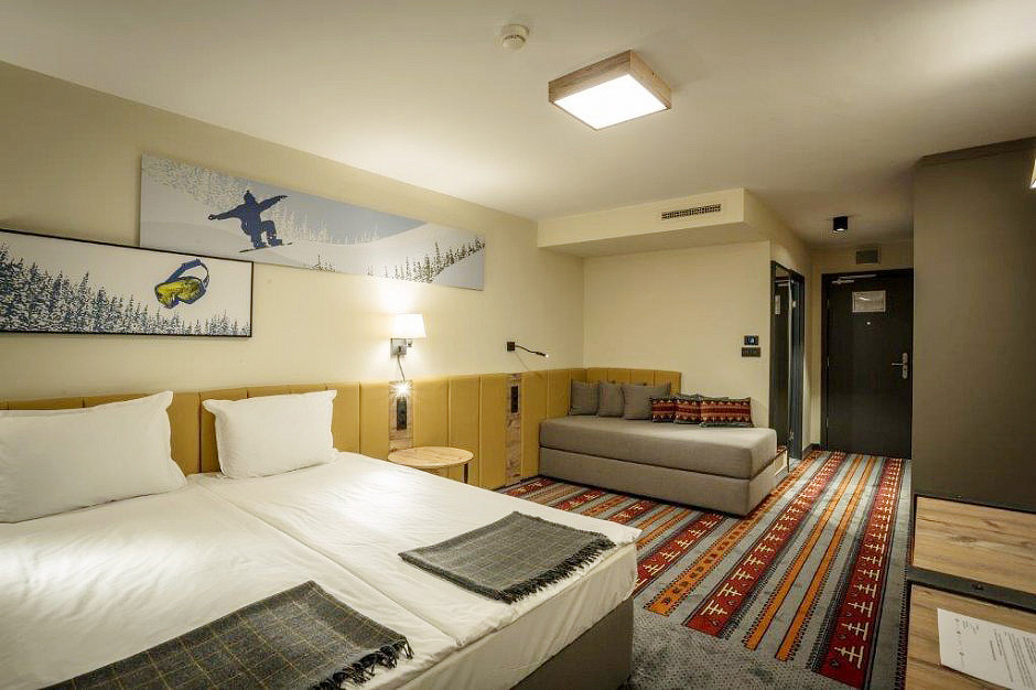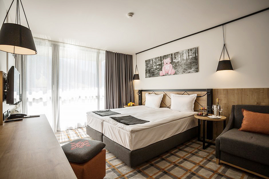 pokój z łóżkiem małżeńskim lub dwoma pojedynczymi łóżkami (można je zsunąć) i dodatkowym łóżkiem w formie rozkładanej sofy dla 1 dziecka do nieukończonych 12 lat, łazienka; typ Superior 2+1 view posiada balkon z widokiem na stoki narciarskie