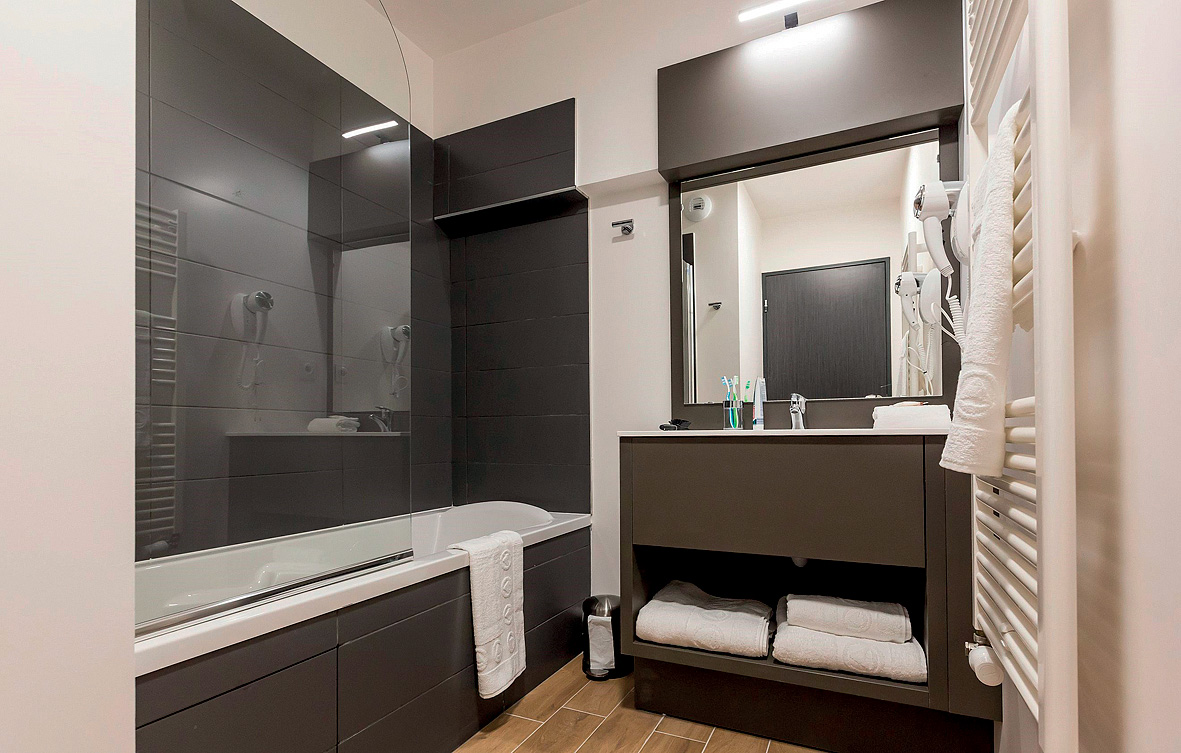 56 m² - 1 sypialnia z łóżkiem małżeńskim, 1 sypialnia z 2 łóżkami pojedynczymi, salon z aneksem kuchennym i rozkładaną sofą dla 2 osób (możliwa również sofa typu „szuflada”) lub 1 łóżkiem pojedynczym, 2 łazienki (1 z prysznicem, 1 z wanną), balkon lub taras