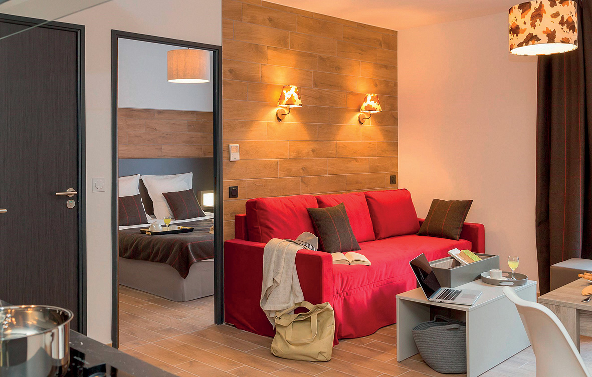 40 m² - 1 sypialnia z łóżkiem małżeńskim, salon z aneksem kuchennym i rozkładaną sofą dla 2 osób (możliwość również rozkładania typu „szuflada”) oraz rozkładaną sofą dla 1 osoby, łazienka z wanną, balkon lub taras