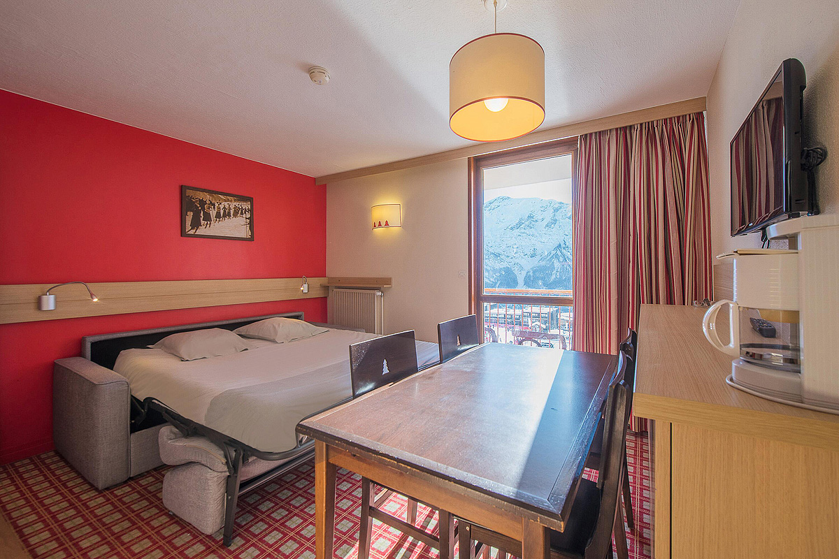 38 m² - 1 sypialnia z 2 łóżkami piętrowymi, salon z aneksem kuchennym i rozkładaną sofą dla 2 osób (możliwa również sofa typu „szuflada”), łazienka, widok na góry
