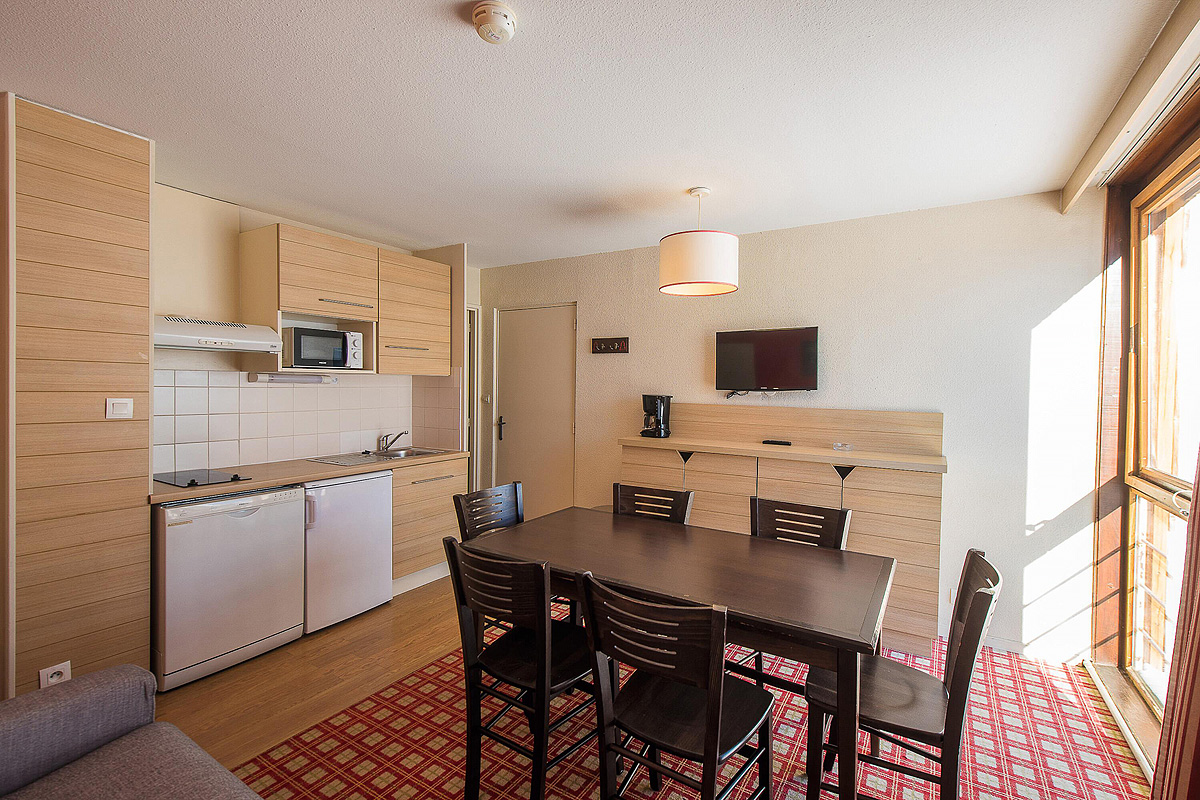30 m² 1 sypialnia z łóżkiem piętrowym, salon z aneksem kuchennym i rozkładaną sofą dla 2 osób (możliwość spania również w wersji „szufladkowej”), łazienka, balkon z widokiem na góry