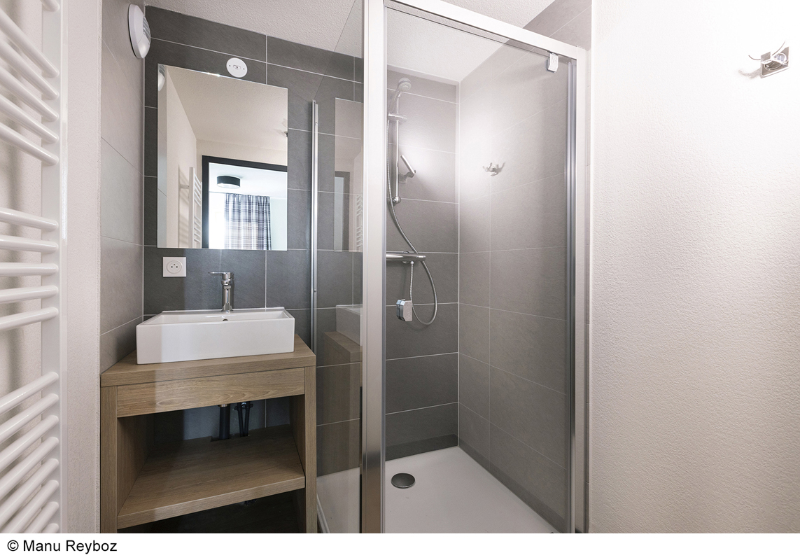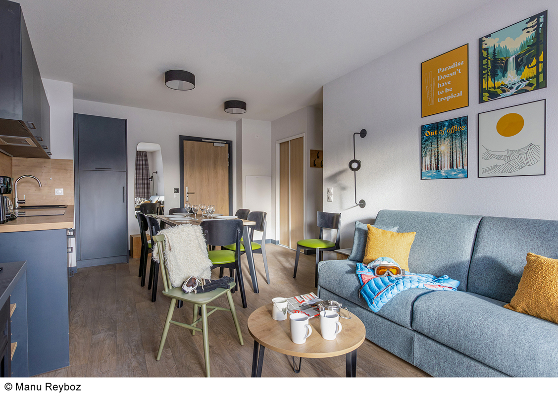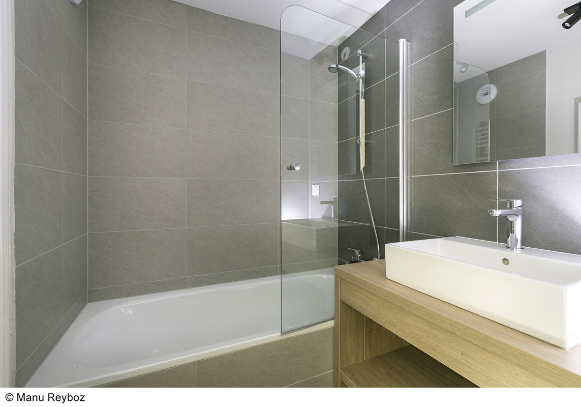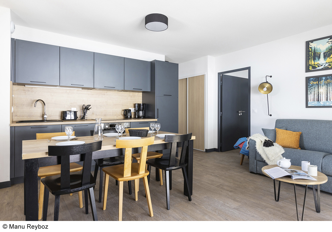 44 m² - 1 sypialnia z 2 pojedynczymi łóżkami (można je połączyć w łóżko podwójne), 1 sypialnia z łóżkiem piętrowym, salon z aneksem kuchennym i rozkładaną sofą dla 2 osób (możliwa również sofa typu „szuflada”), 2 łazienki (1 z prysznicem, 1 z wanną, 1 bez toalety), balkon