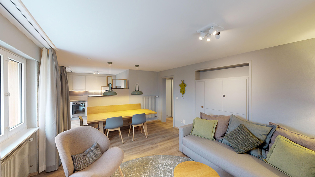 53 m² - sypialnia z 2 pojedynczymi łóżkami, kolejne 1 pojedyncze łóżko przy wejściu do apartamentu, salon z aneksem kuchennym i rozkładaną sofą dla 2 osób, łazienka, balkon; apartament zazwyczaj znajduje się na poddaszu ze skośnym dolnym sufitem