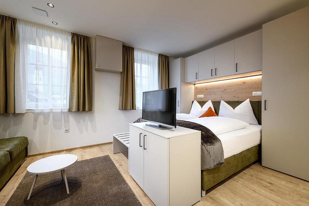 31 m² – salon z aneksem kuchennym, łóżkiem małżeńskim i rozkładaną sofą dla 2 osób, łazienka